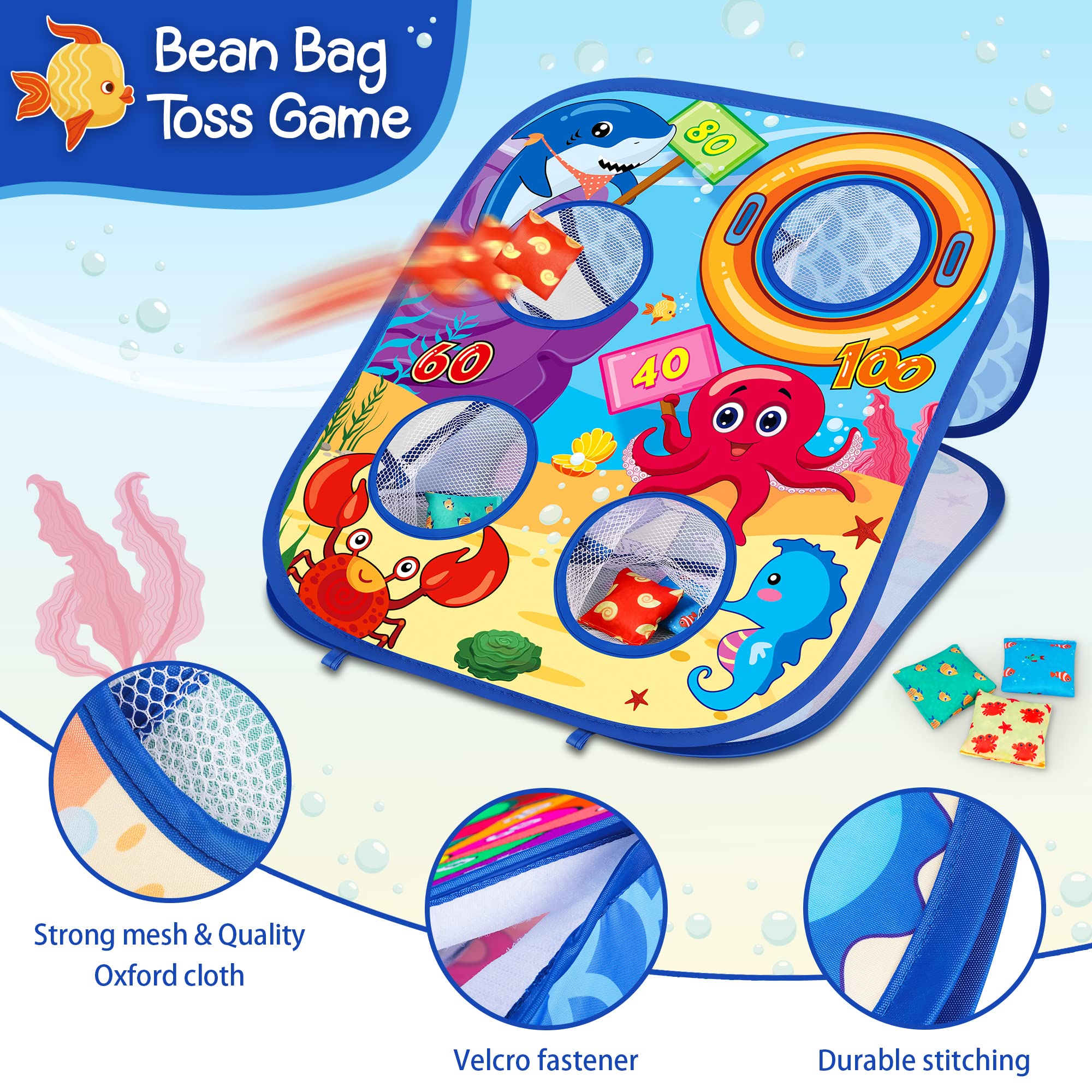 - ud83dudc22ud83eudd88 2 in 1 Bean Bag Toss Game Set: This Sea theme cornhole game combine 2 gameplay with easier horizontal bean bag toss game and harder vertical dart game, the two sides can switch back and forth to enjoy different game modes, it can exercise child's fine motor skills, stimulate their creativity and challenge