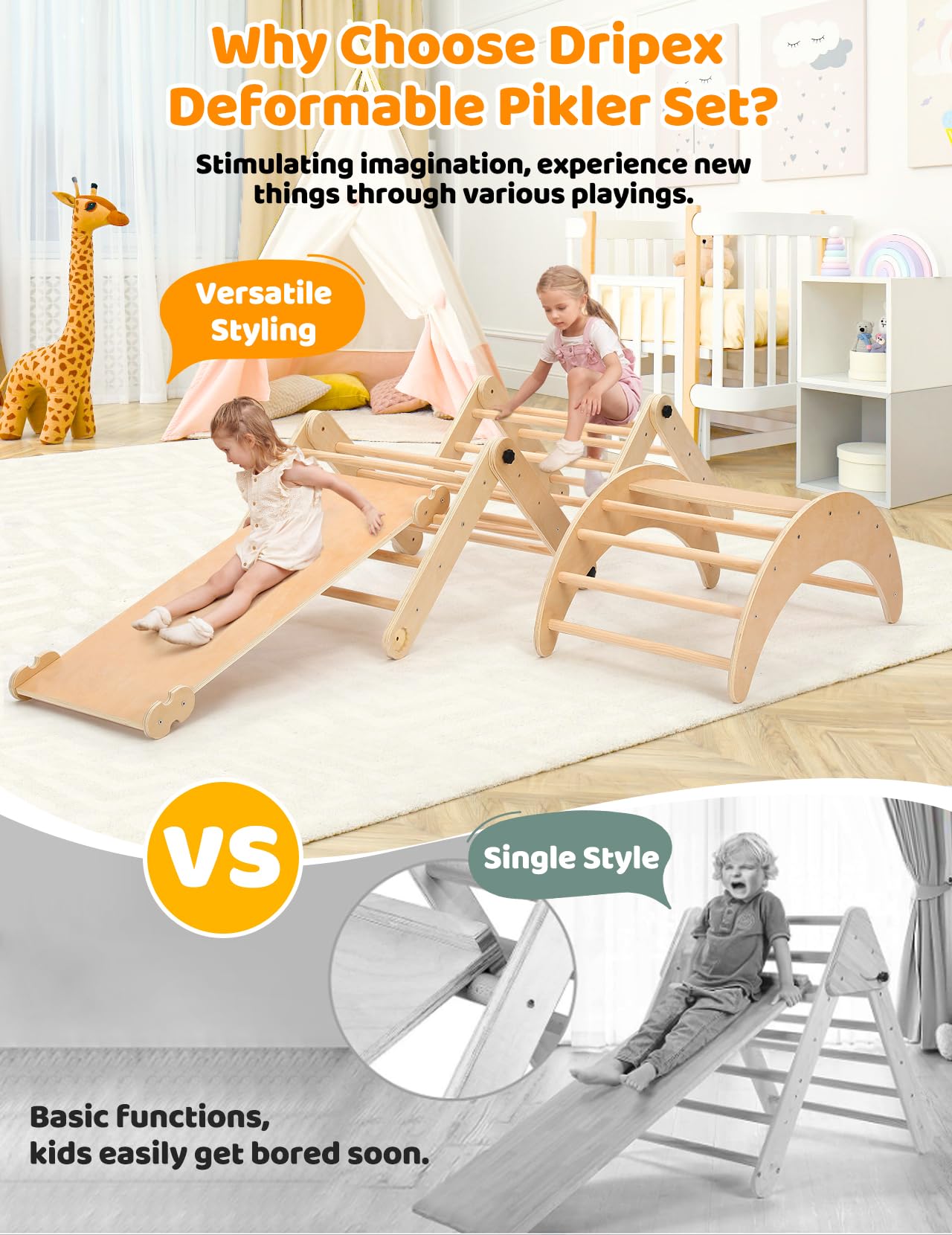 - ud83eudd47u3010Perfect Montessori Climbing Toys for Kids Growingu3011Dripex deformable pikler set aim to stimulate imagination, promote gross motor skills, helping brain development. By creating and exploring more playing modes of the Pikler triangle, kids will learn to become little adventurer and better take eyes off from all types of electronics.