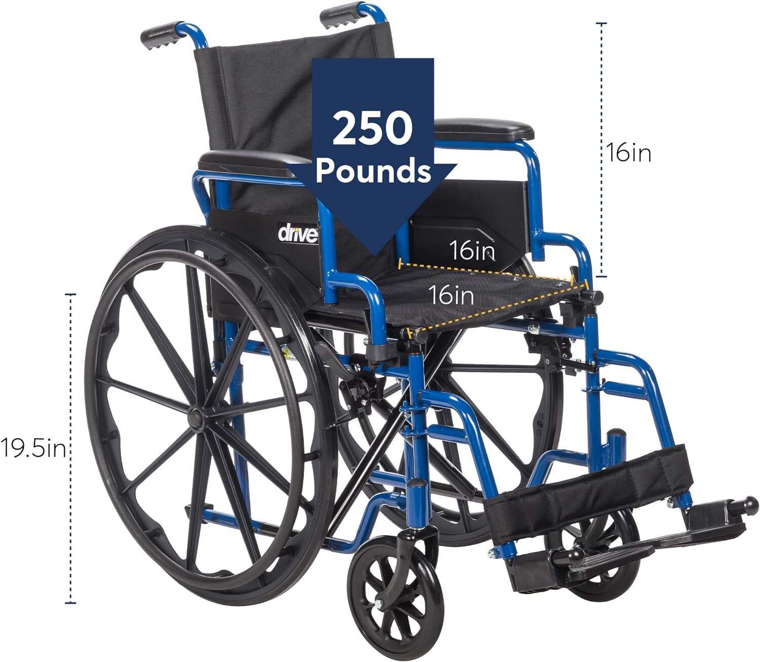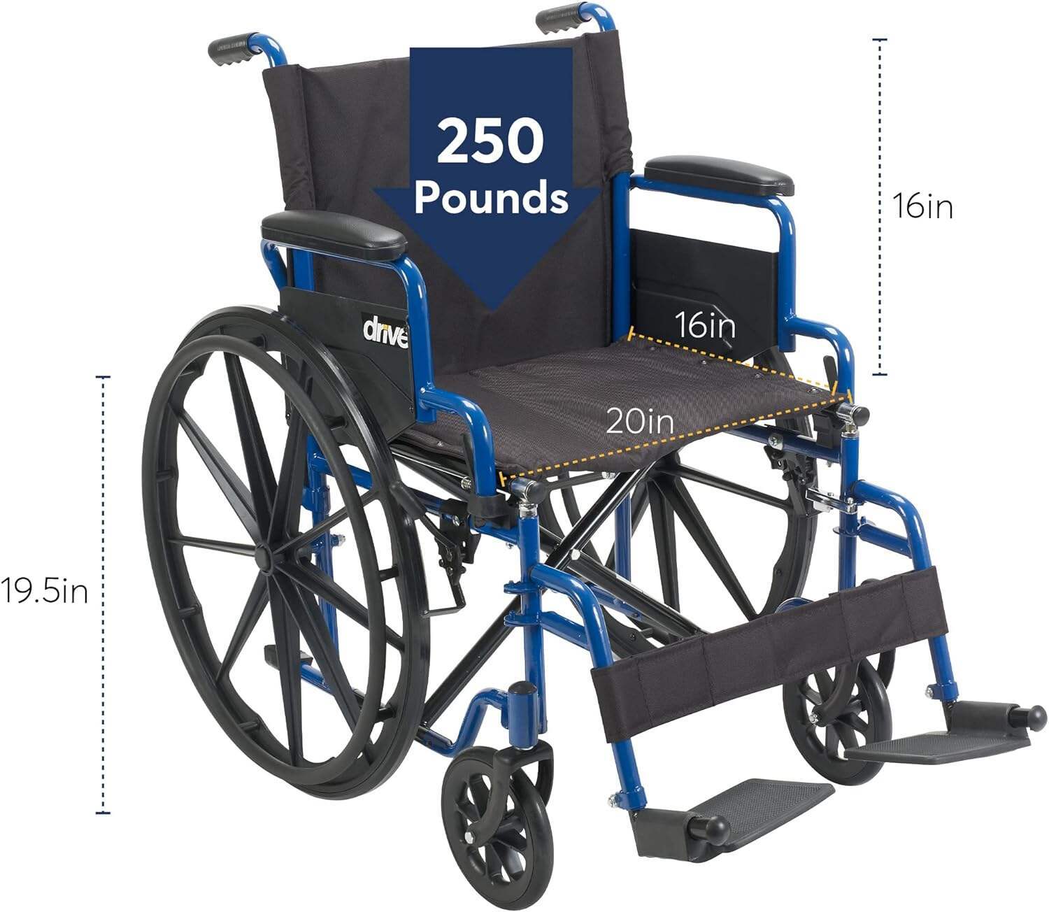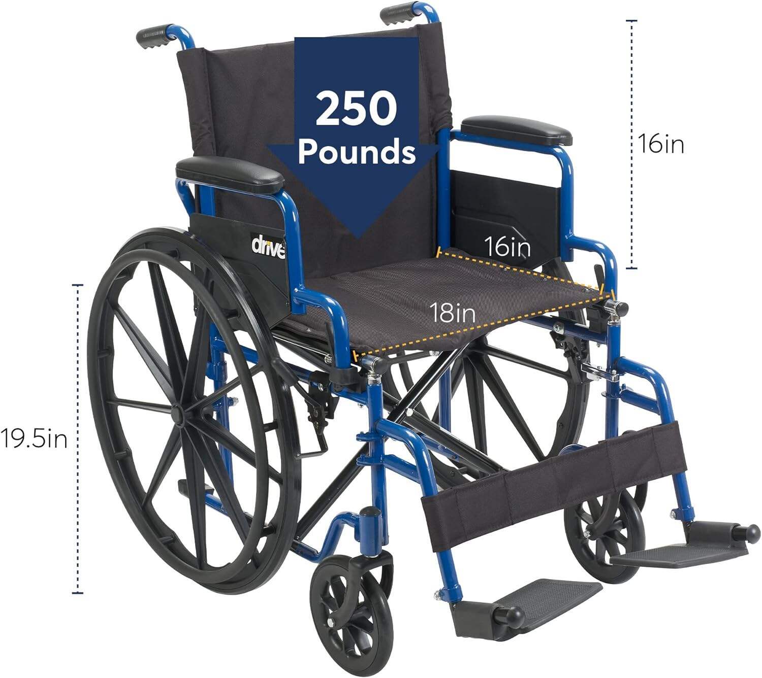 - Overall dimensions: 42"(L) x 24"(W) x 36"(H); Closed width: 12.5"; Seat dimensions: 16"(D) x 18"(W) x 19.5"(H); Armrest height: 8"; Weight capacity: 250 pounds. Comes with push-to-lock wheel locks