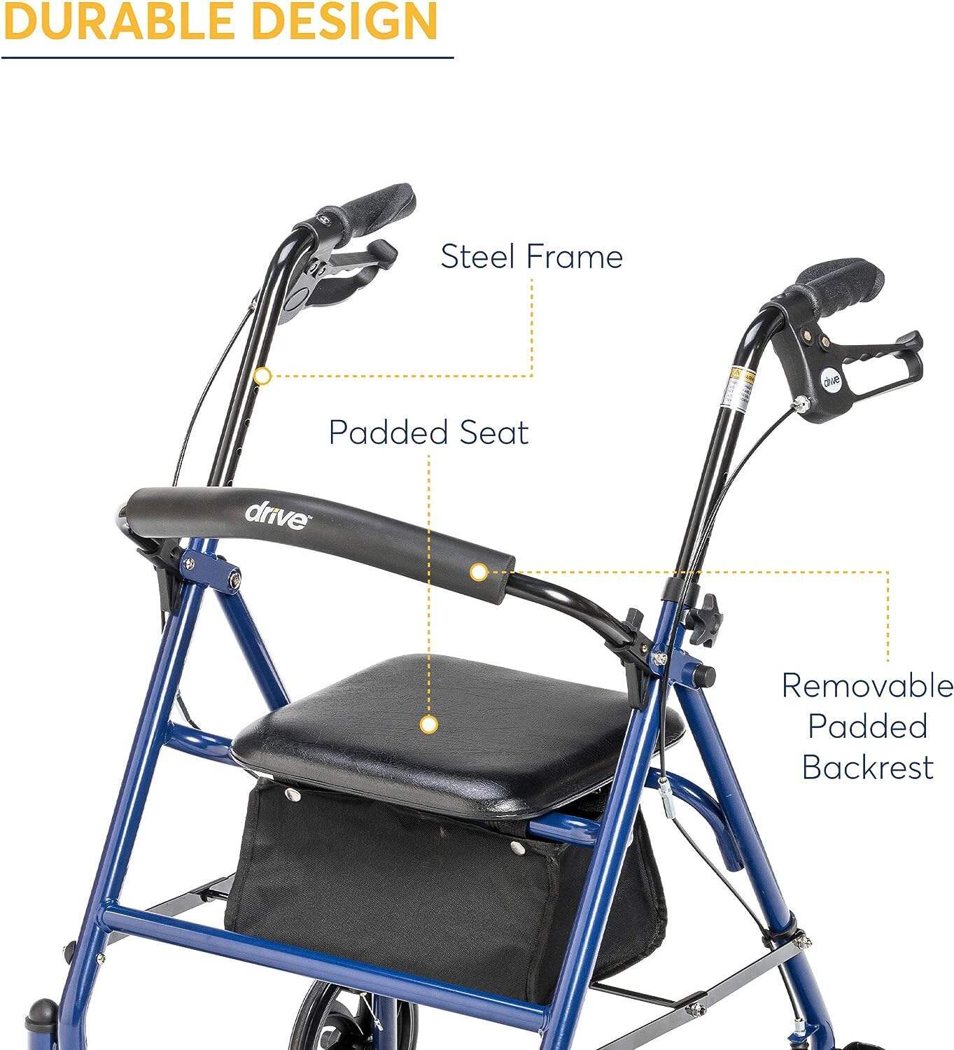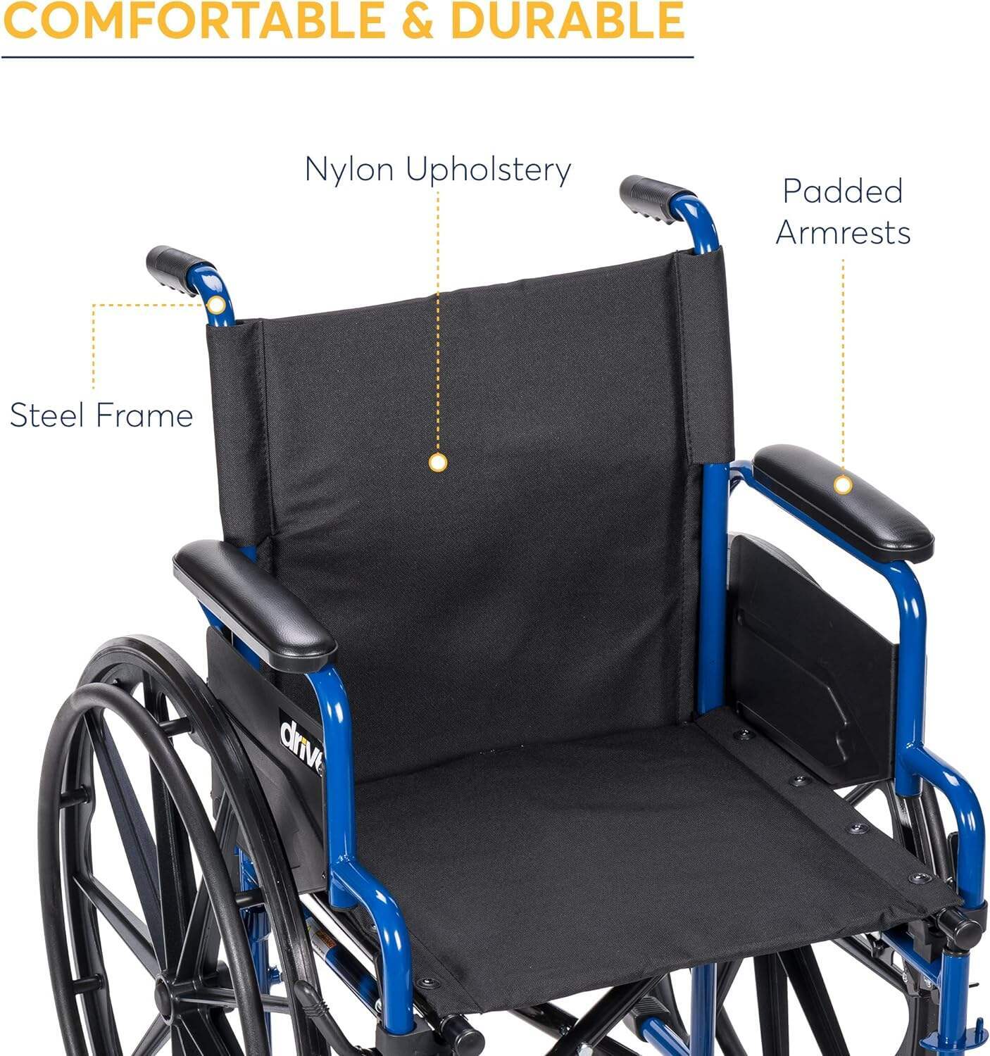 - 18" padded nylon wheelchair seat ensures lasting comfort and is easy to clean.Do not use an abrasive cleanser that will scratch the finish