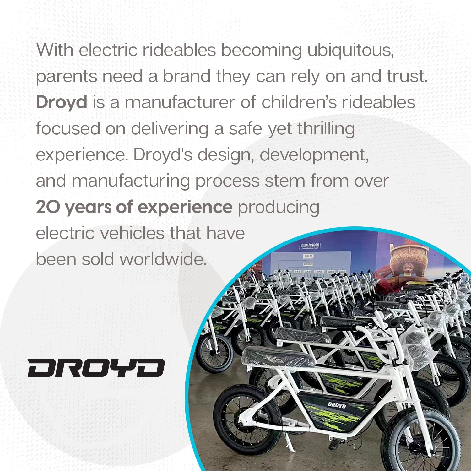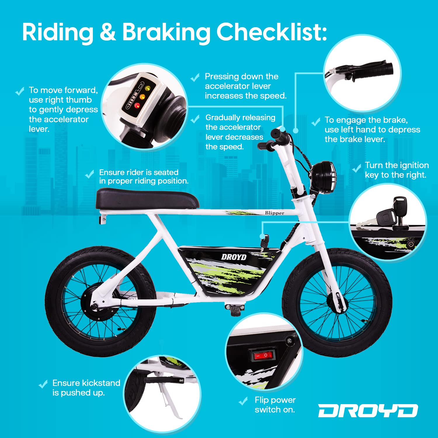 - Blipper and Go: Our electric motorized bike is convenient for parents as it comes mostly preassembled, only needing to install the kickstand & handlebar. Parents can register for warranties directly on the Droyd website.