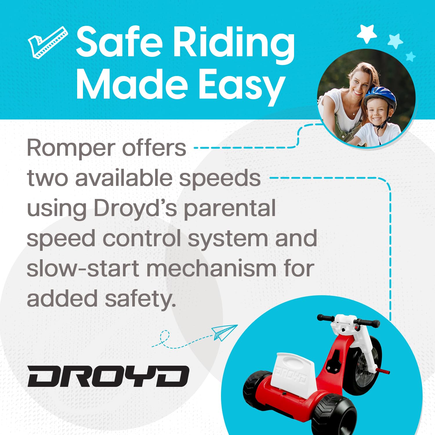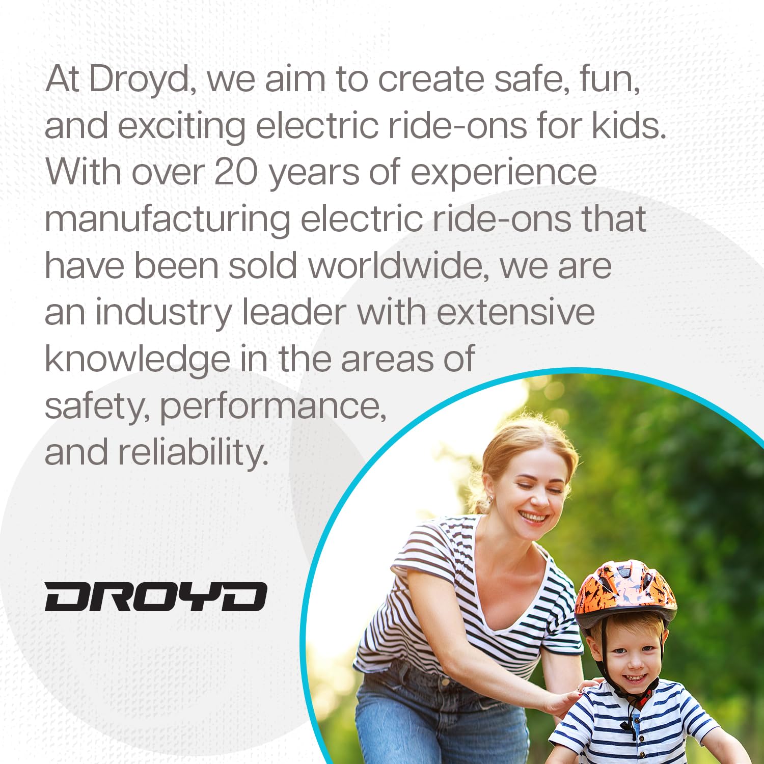 - Droyd's mission is to create safe, fun, and exciting electric ride-ons for kids. With over 20 years of experience, we lead the industry with extensive knowledge in the areas of safety, performance, and reliability.