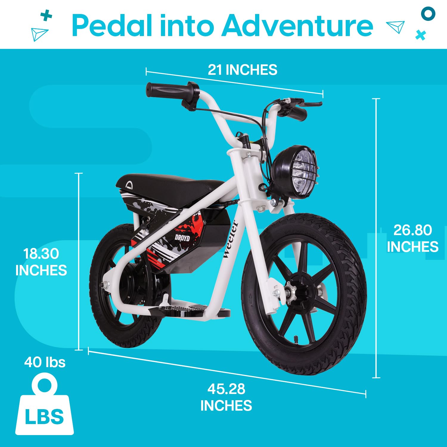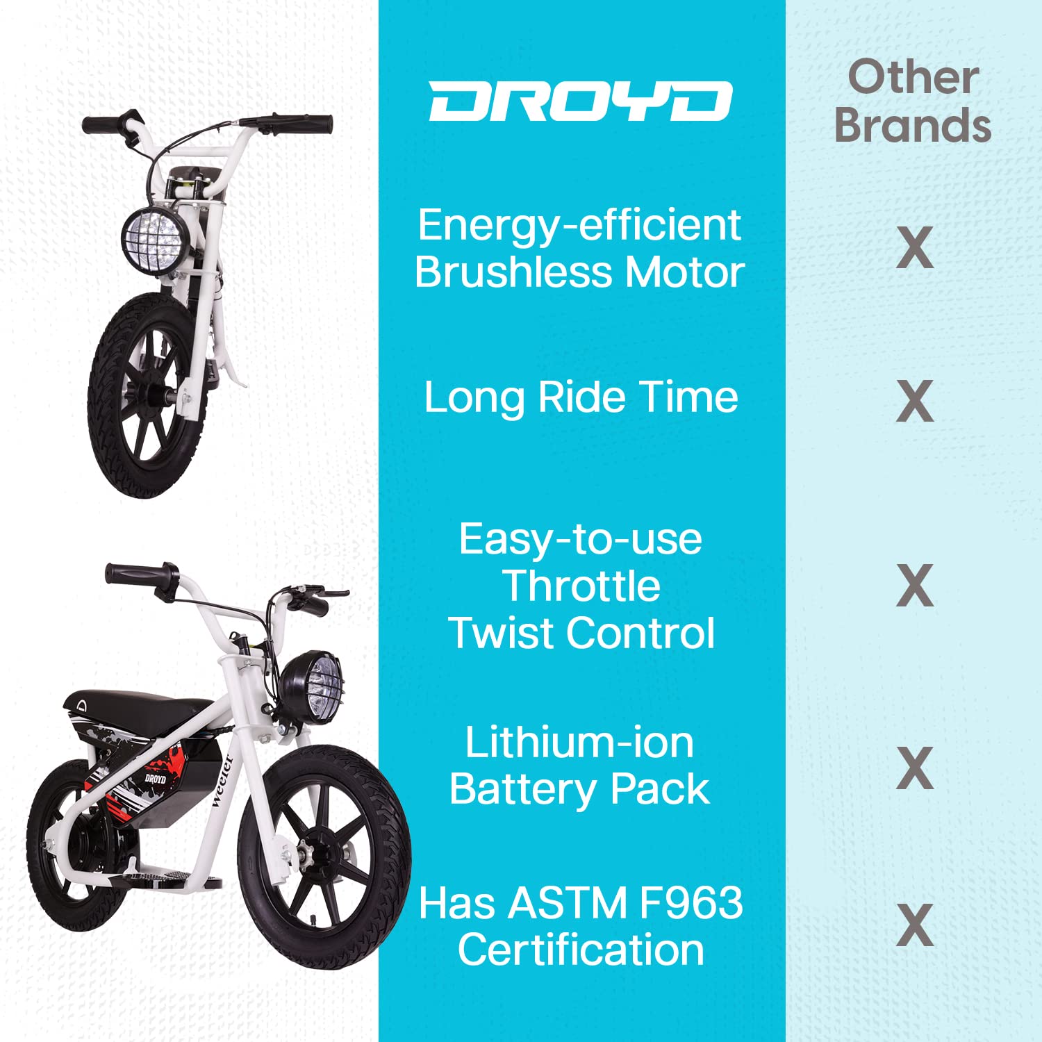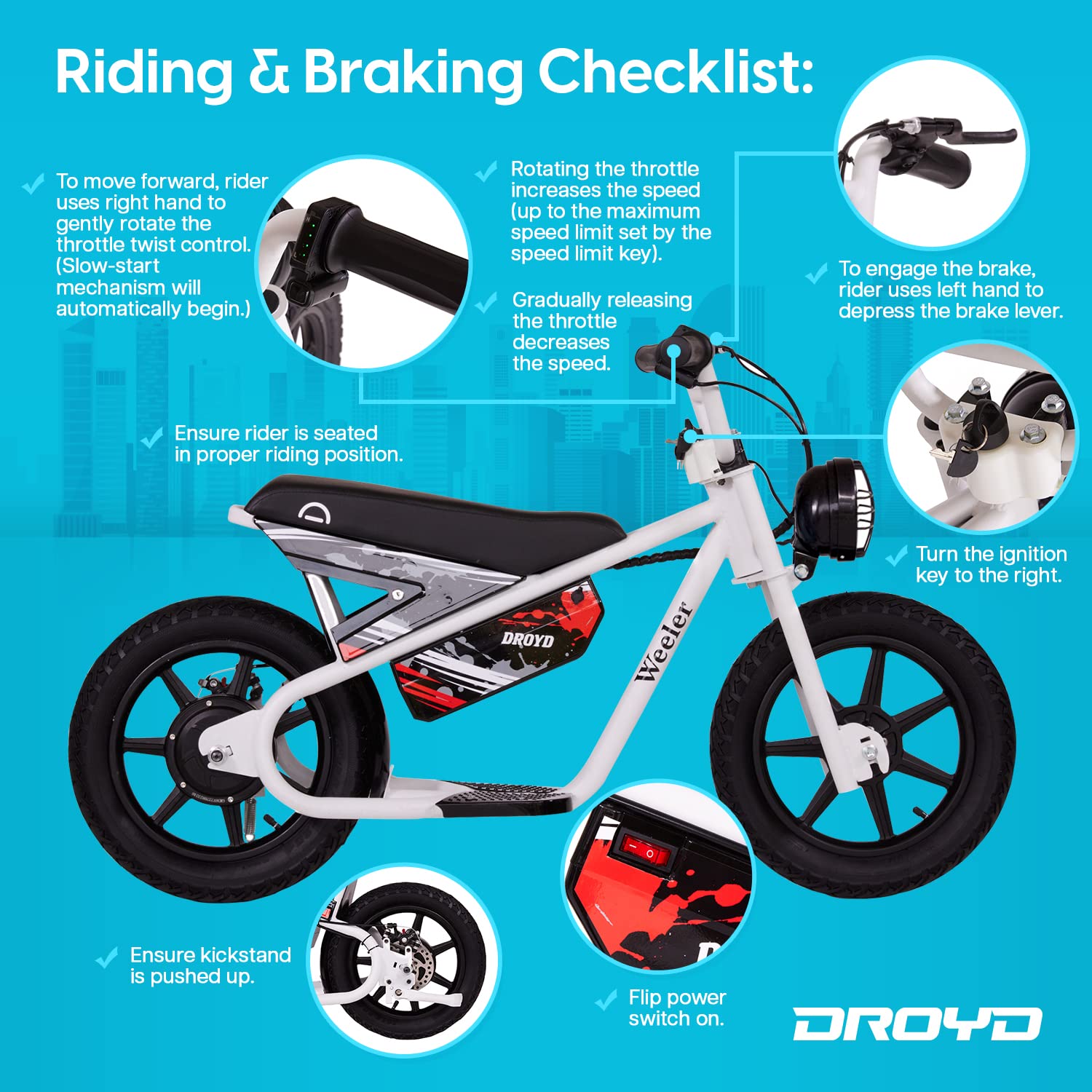 - Weeler and Go: Our electric motorized bike is convenient for parents as it comes mostly preassembled, only needing to install the kickstand & handlebar. Parents can register for warranties directly on the Droyd website.