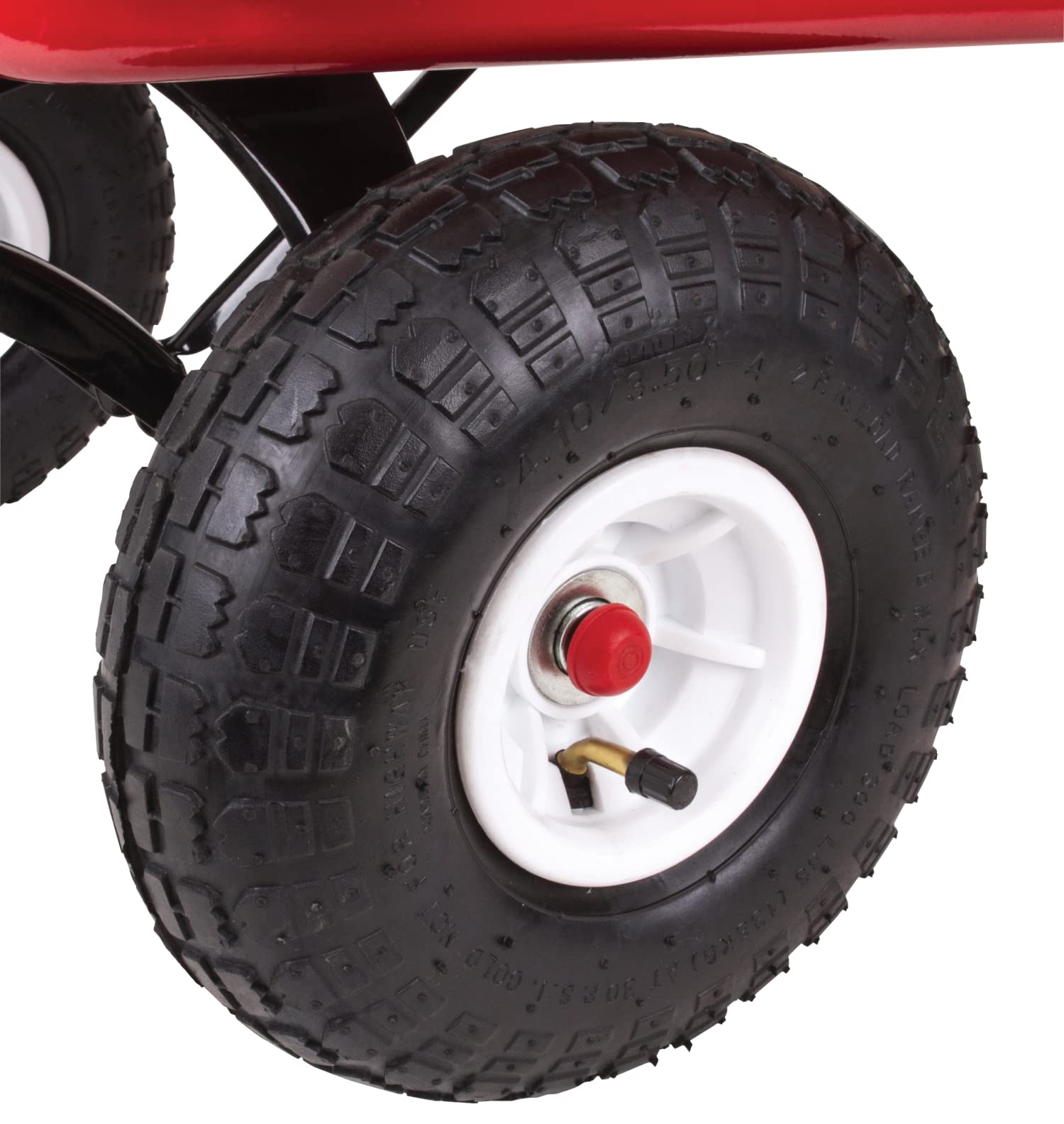 - SPECIFICATIONS: This all-terrain kidsu2019 wagon is equipped with tires having 15 in. wider wheelbase, 4 in. wide grip handle, 3/8 in. thick wooden panels. This heavy-duty toy wagon can hold up to 300 lbs. of weight per tire.
