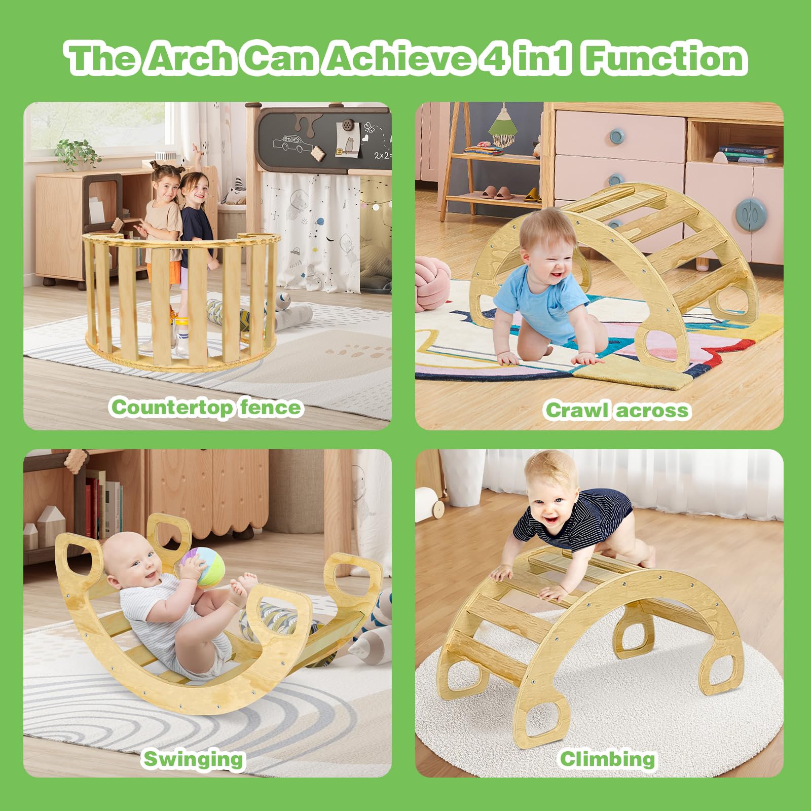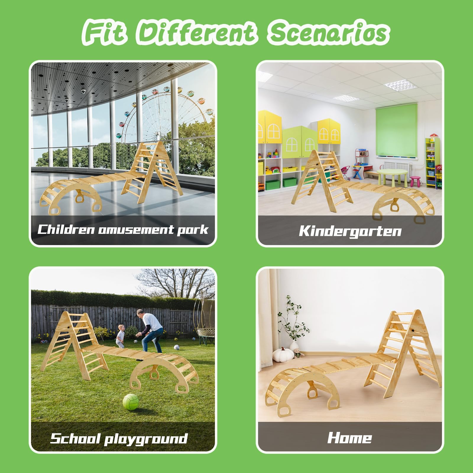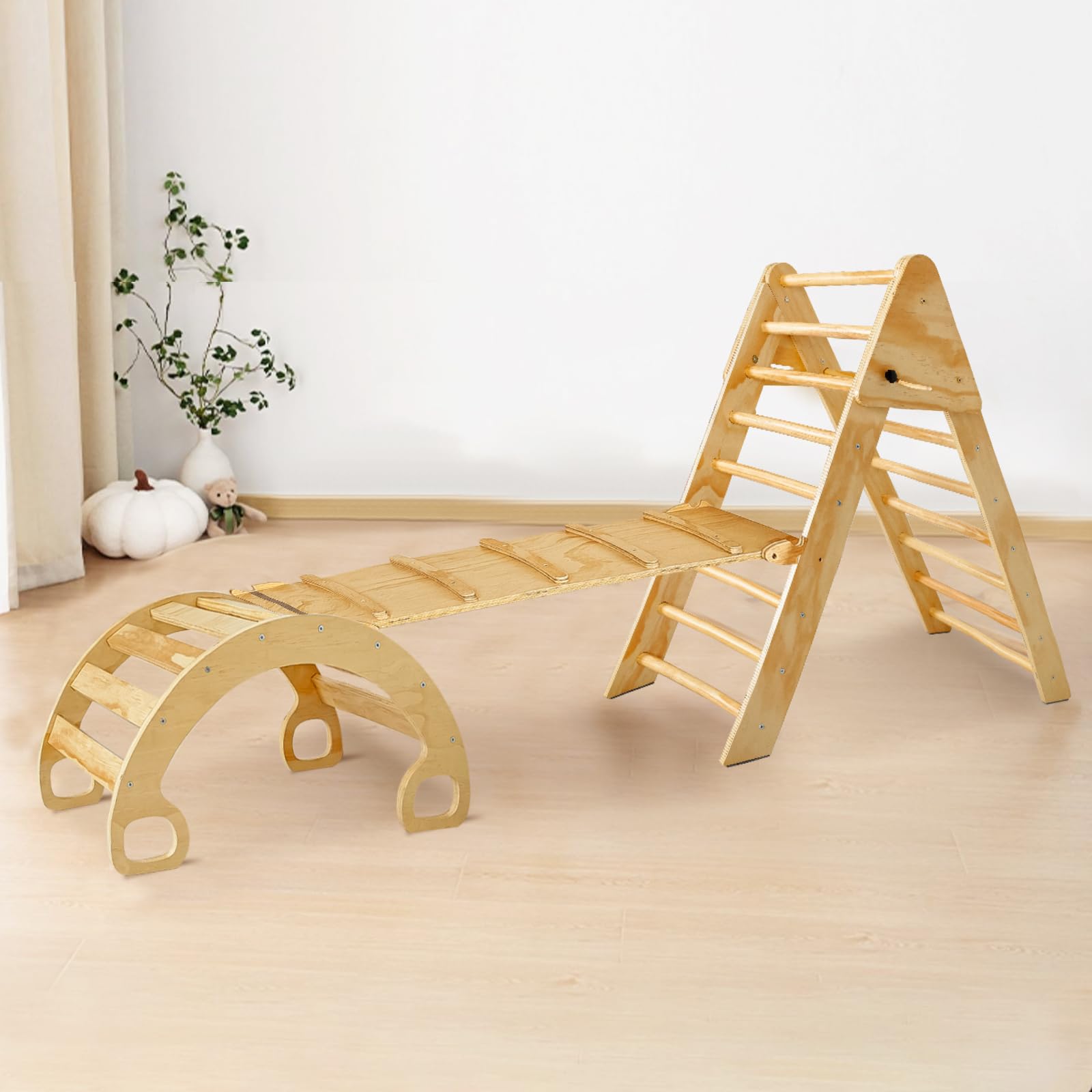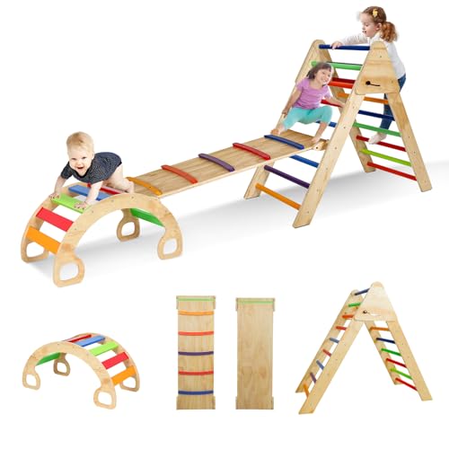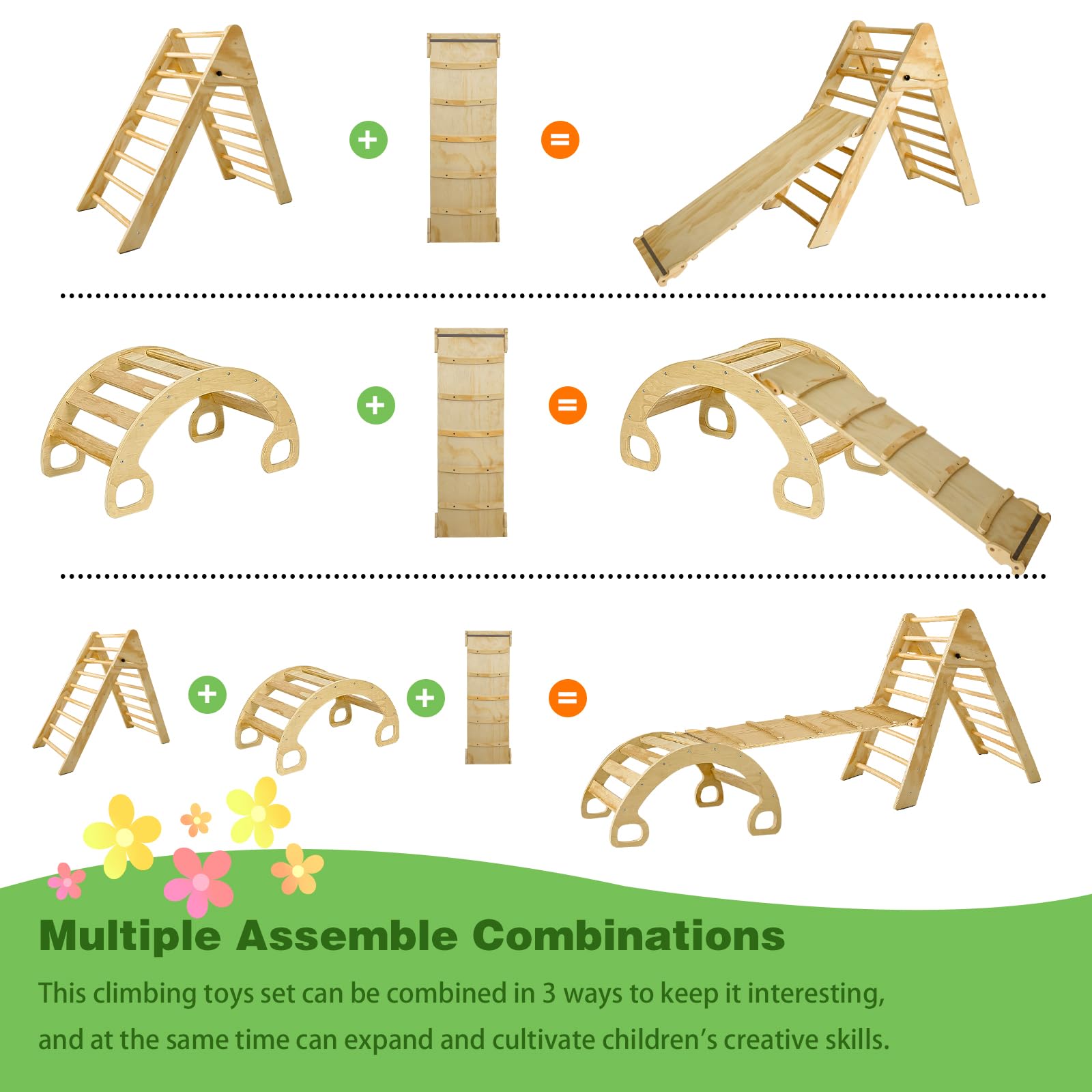- u3010Multiple Combination Climbing Toysu3011This set of climbing toys consists of 3 parts, triangle climbing frame, arch climbing frame and climbing straight ladder. These three parts can be used individually as triangular or arch climbing frame, rocking chair, balance board, climbing bridge and so on. Can also be used in combination, different combinations bring different fun. Let your kids improve their sensory skills and promote exploration through the toys and let them become more independent.