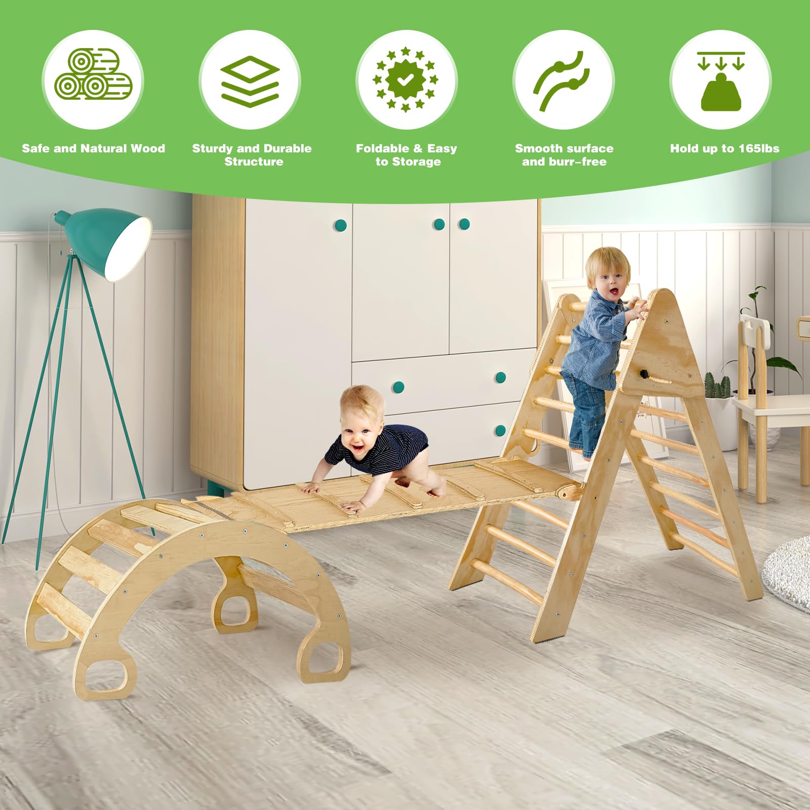 - u3010Sturdy and Durableu3011This climbing toy set is made of reinforced triangular structure combined with "H" shaped base, which makes the whole climbing frame more stable. Made of high quality wood, making the climbing frame stronger, safer and more durable. Suitable for 2-3 children to play together.
