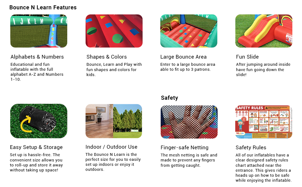 - EDUCATIONAL JUMP AND SLIDE - This playhouse features educational elements like the full Alphabet from A to Z, Numbers 1 to 10, and even Colors and Shapes on the bounce house jumping area. Your kids will love all the elements in this toddler bounce house as they jump and learn all day long.