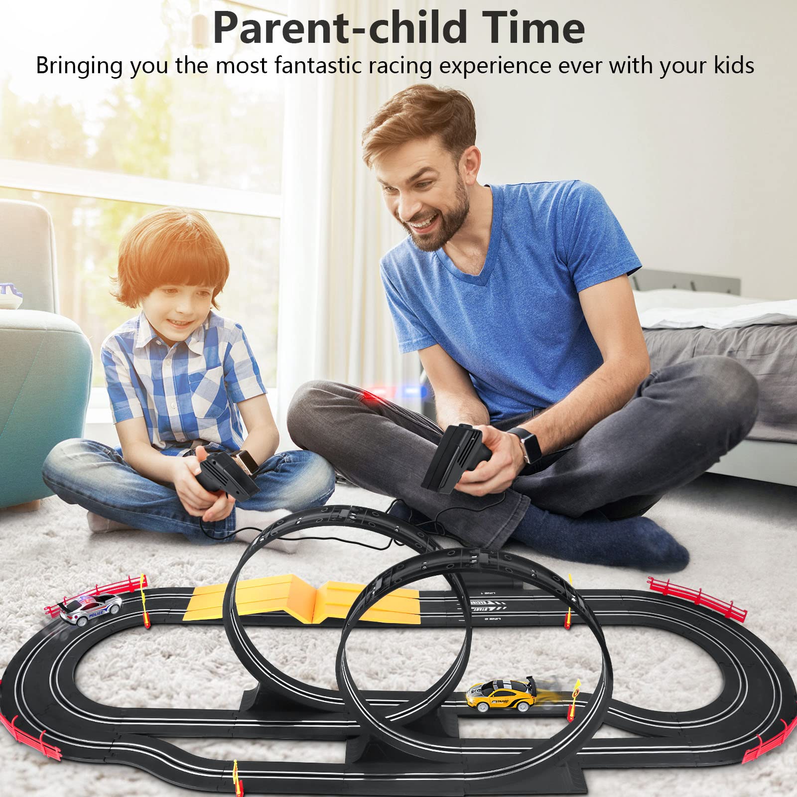 - Enjoy High-Speed Car Racing Game with your Kids: You feel the power and speed of the 1:43 scale size cars racing on the track measuring over 18.4 feet and reaching scale speeds about 300-370 mph! Bringing you the most fantastic racing experience ever with your kids.