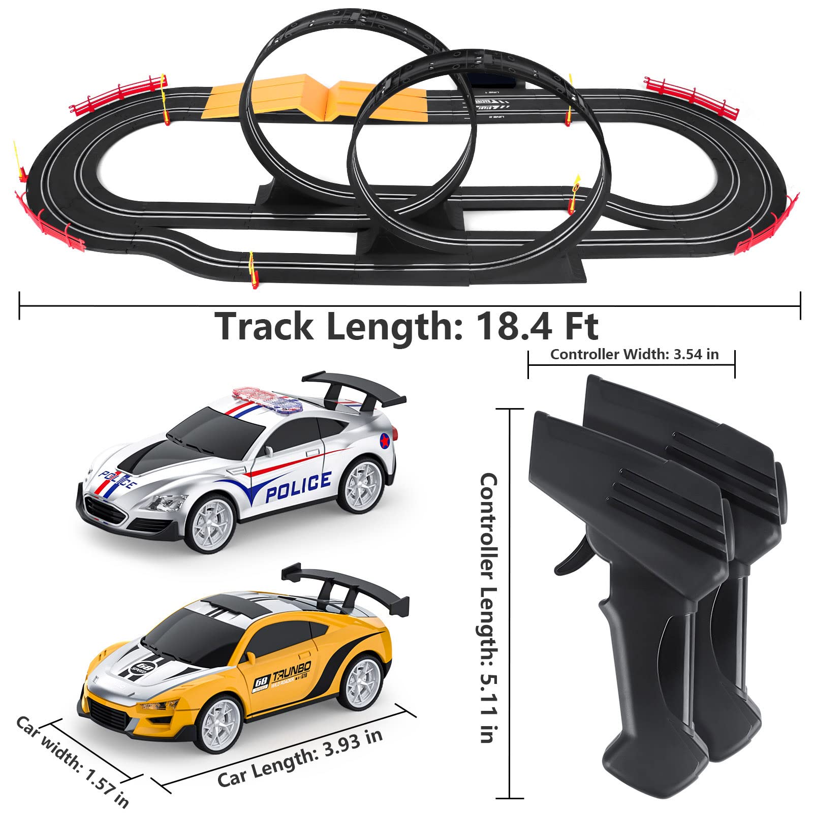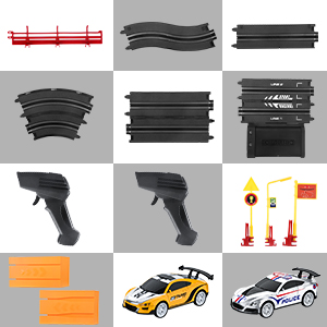 - 18.4 Ft Car Track Length Slot Car Race Track: With 4 * Plastic Fence, Plastic Straight Race Road * 20, Adapter(No need Batteries) * 1, Controller * 2, Plastic Jumping Board * 2 and High-Speed Slot Car * 2, about 18.4 feet of high-speed track length. How to assemble the race car track set, please check the video.
