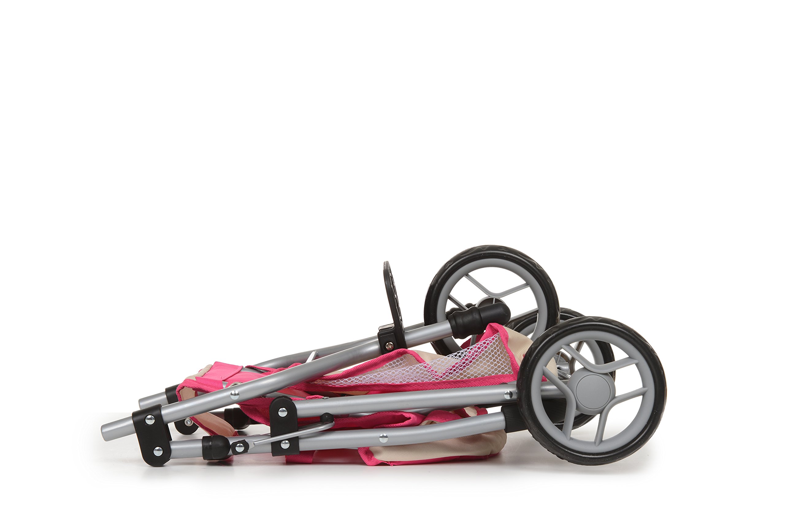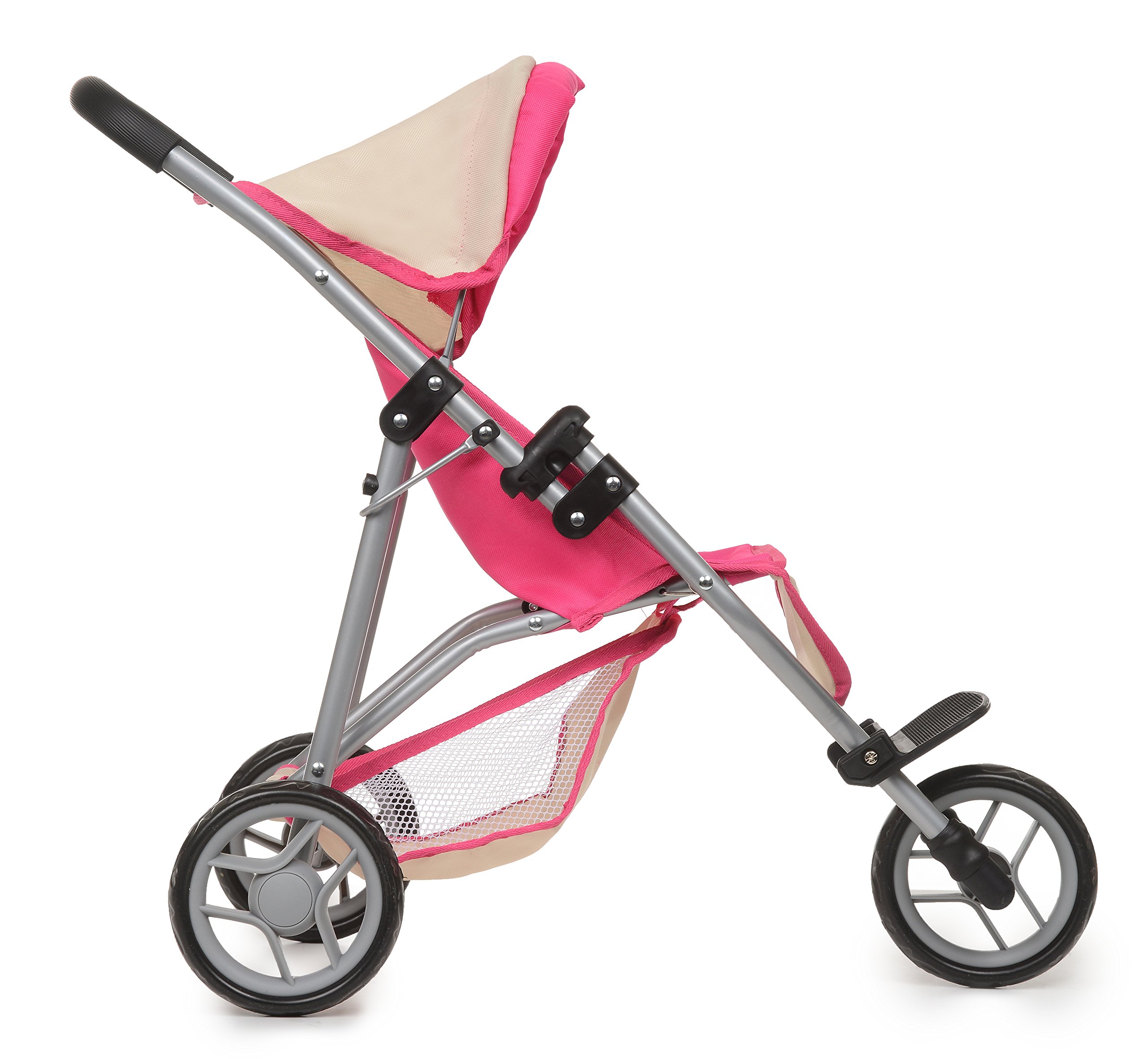 - PINK DOLL STROLLER: Jogger Style Baby Doll Hot Pink Stroller with hood, seat belt, and basket as toy storage on the bottom which is the perfect addition to the baby doll accessories for your baby girl or boy Foam grip on handle for comfortable pushing. Made to fit in any play area Compatible with 12" to 18" dolls, and is recommended for children ages 2 year and up.