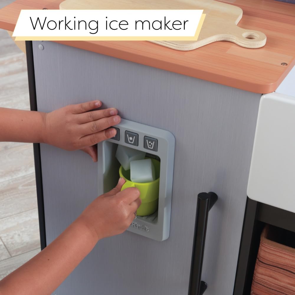 - REALISTIC FEATURES: Wood vegetables are held together with self-adhesive closures for a crisp sound and clean cut when sliced on the chopping board. Ice maker really dispenses play cubes into a cup.
