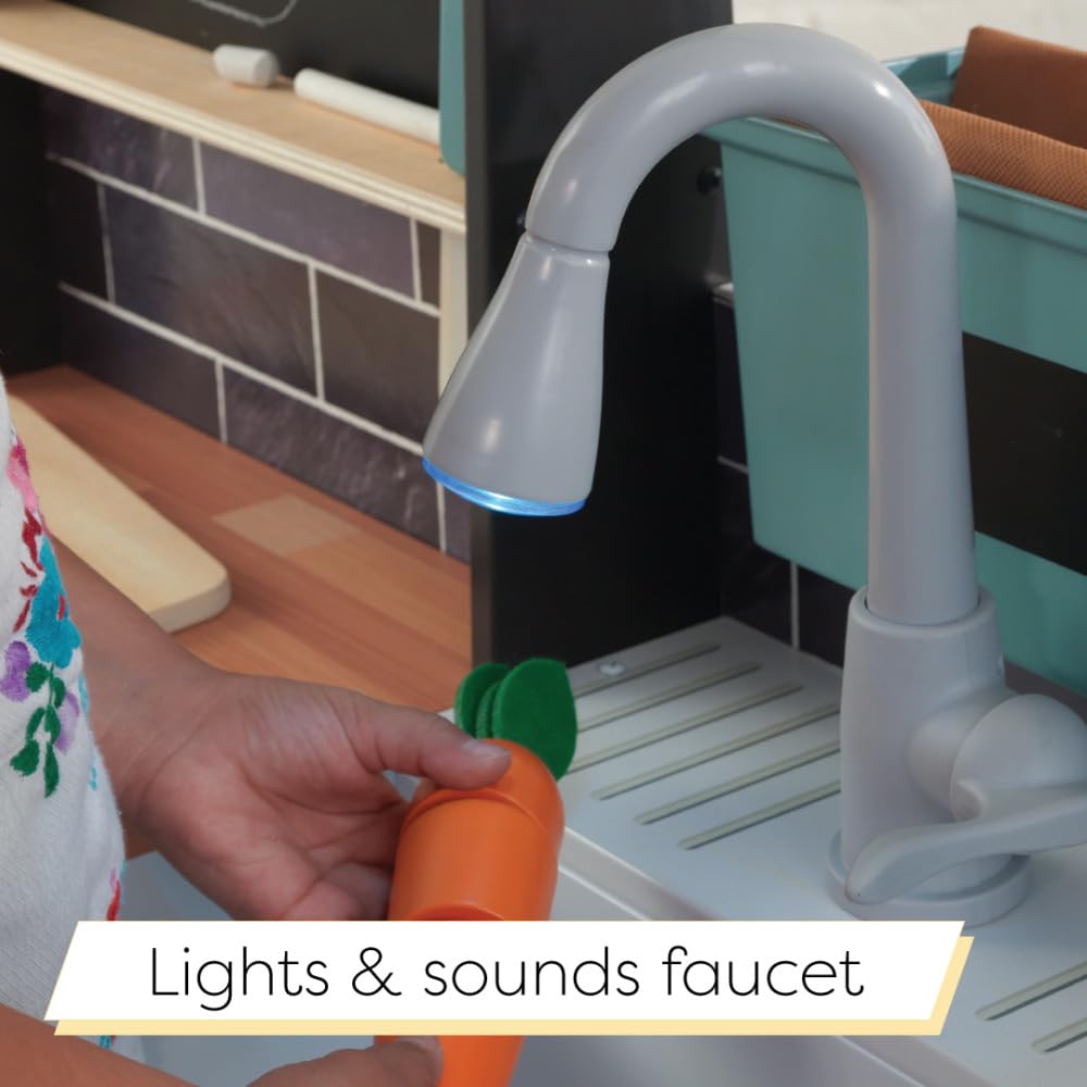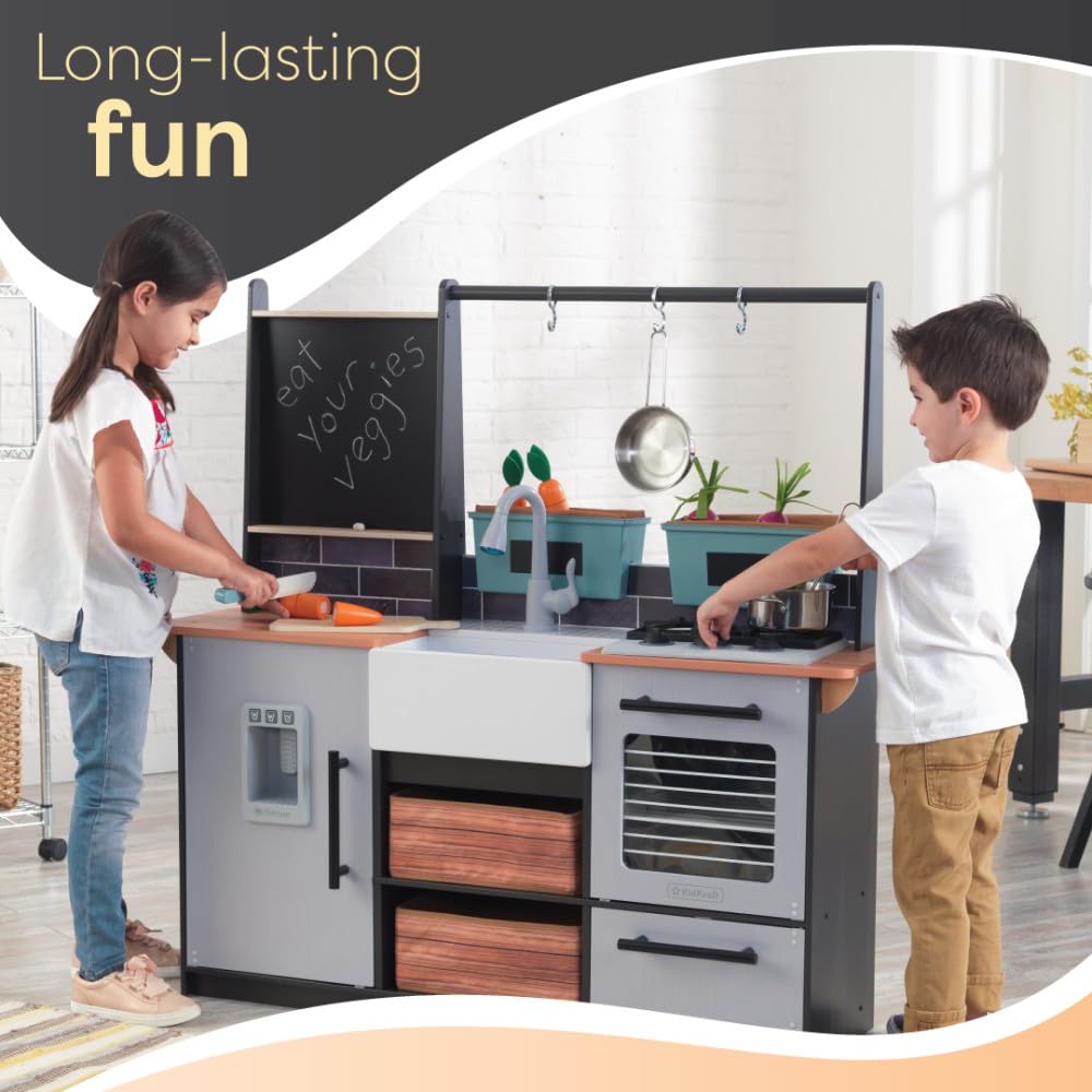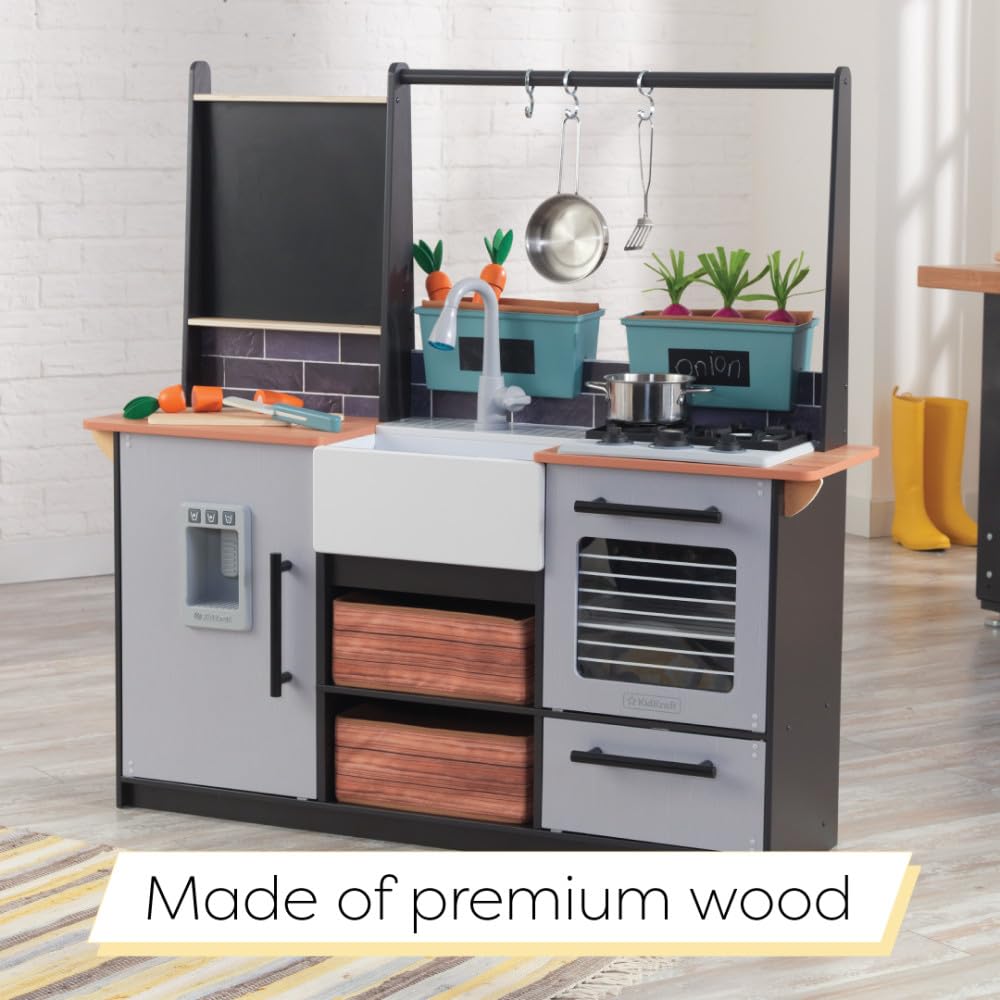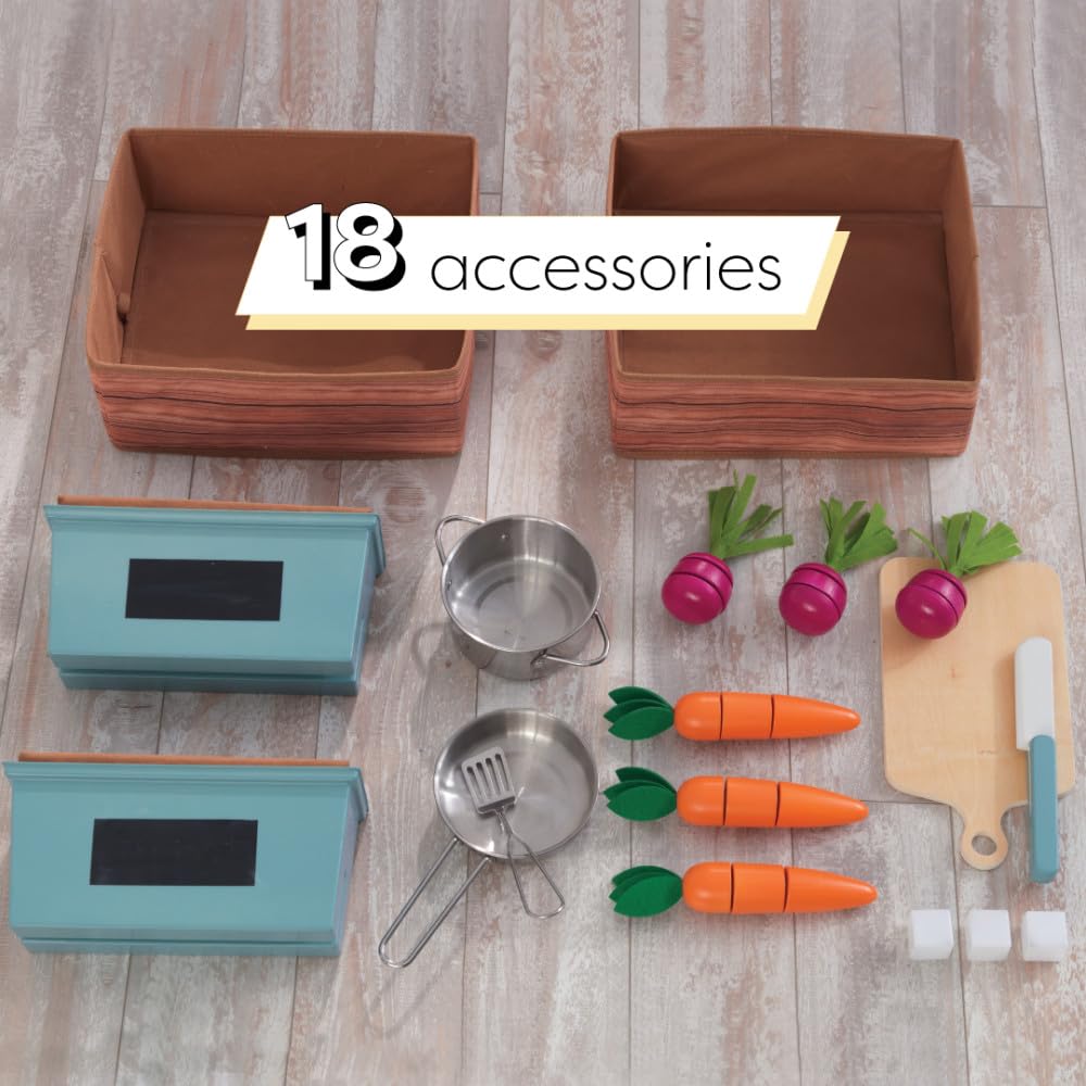 - PLANT VEGGIES: Wooden play kitchen recognized for its garden-to-plate play has planters with vegetables that nestle inside the "dirt". Even write the crop name on the chalkboard label.