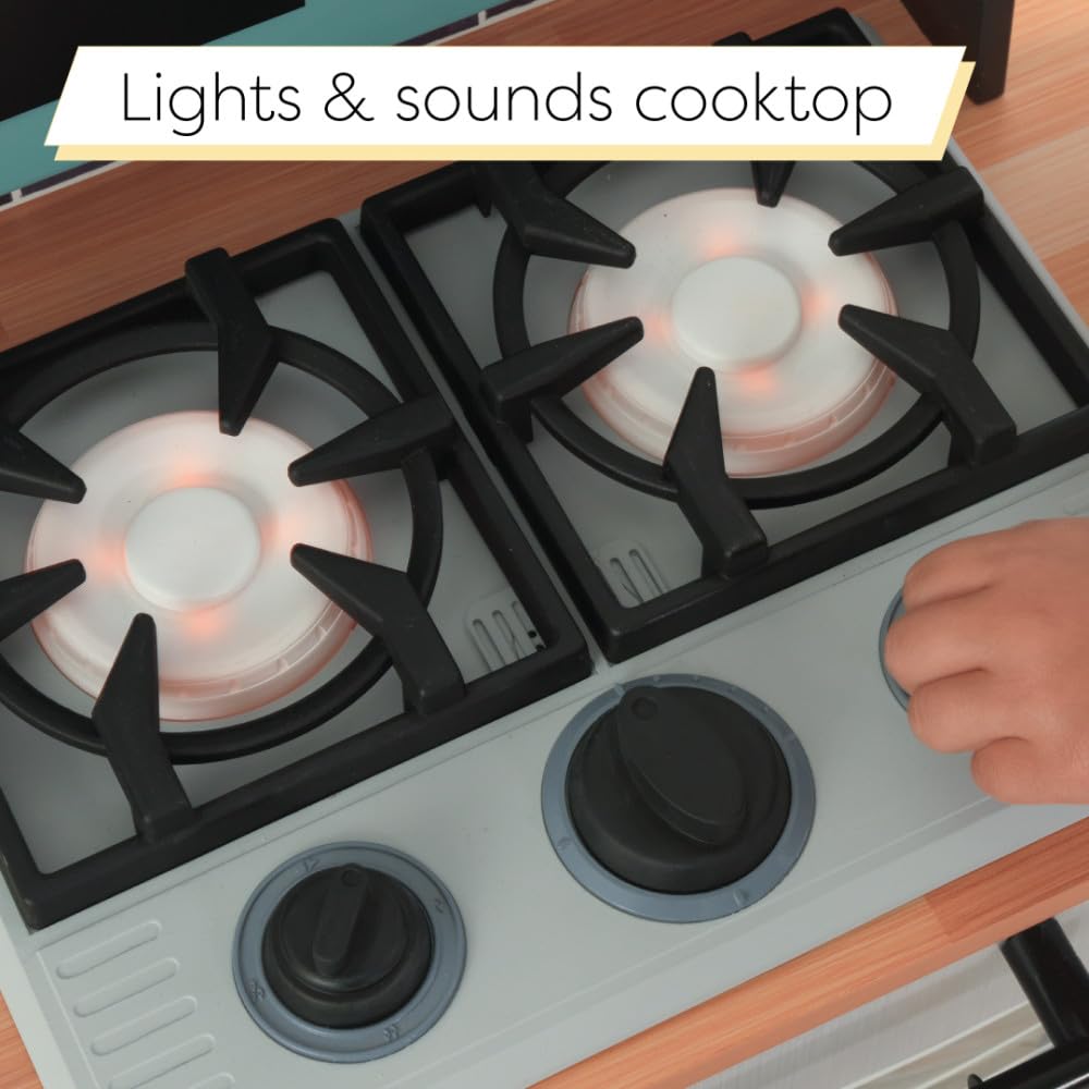 - LIGHTS & SOUNDS: Faucet lights up and makes running water sounds and cooktop lights up and makes sizzling noises.