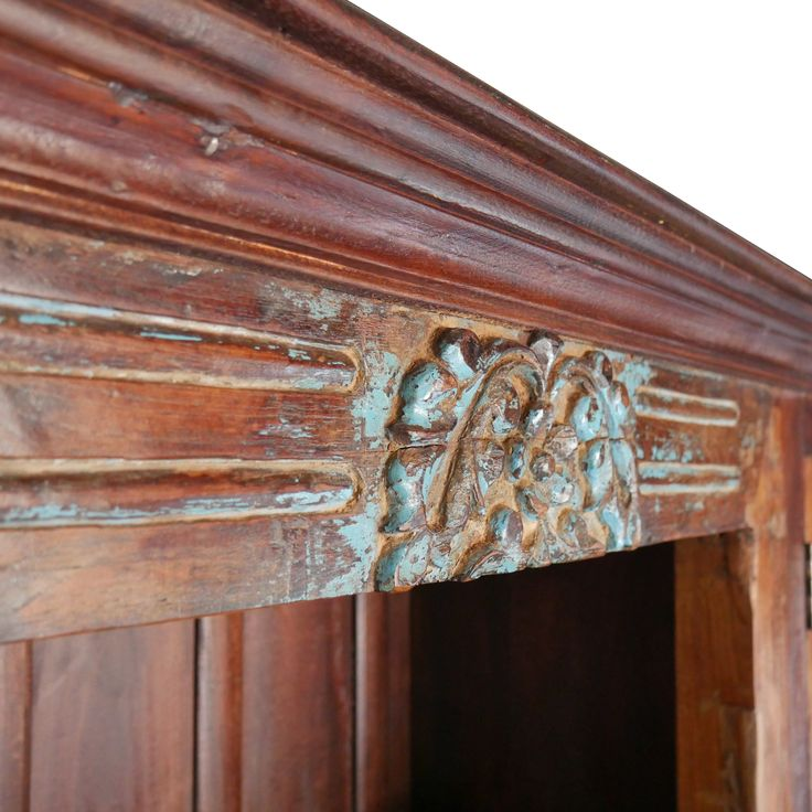 - Repurposed 1900s teak wood doors with original carvings and painted patina