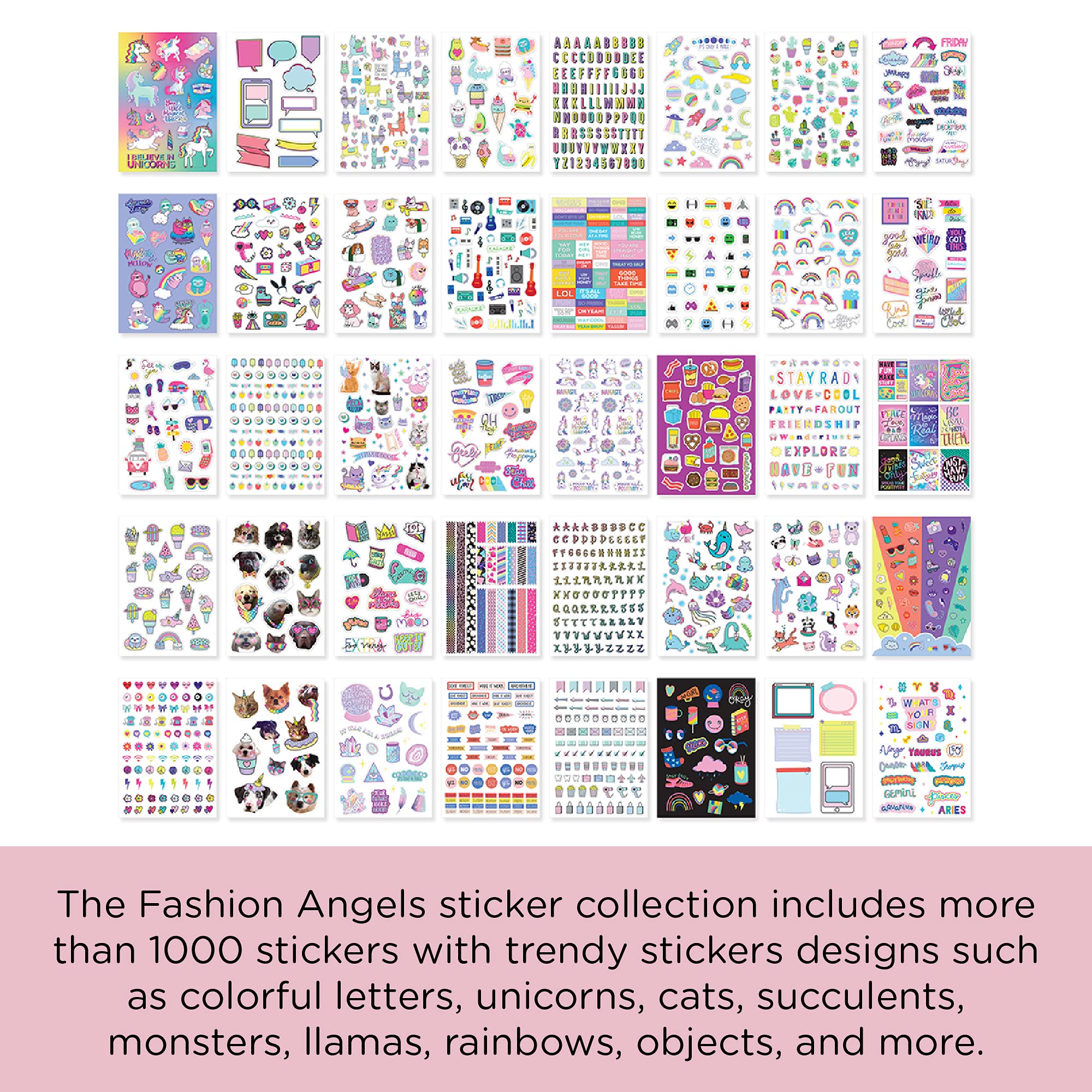 - 1000+ Fun Assorted Stickers - The Fashion Angels sticker collection includes 1000+ high quality stickers with multiple themes. Kids and teens will enjoy cute trendy sticker designs like colorful letters, monsters, donuts, ice cream, taco, rainbows, tropical plants, space objects, puppies, kittens, emojis, unicorns and more.