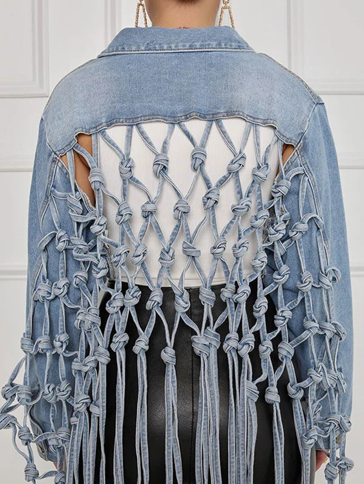 • Fashion Lapel Pocket Strappy Grid Tassels Denim Jacket