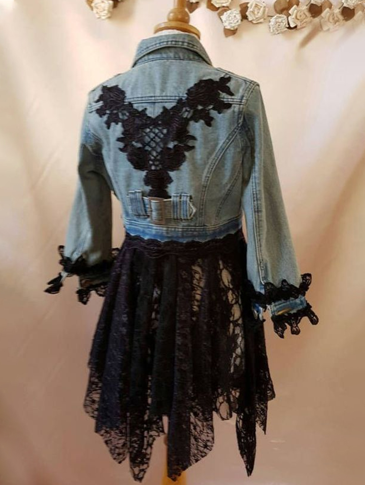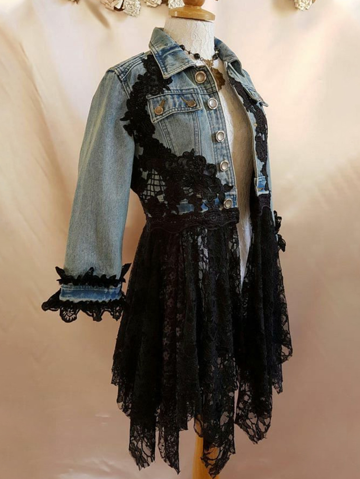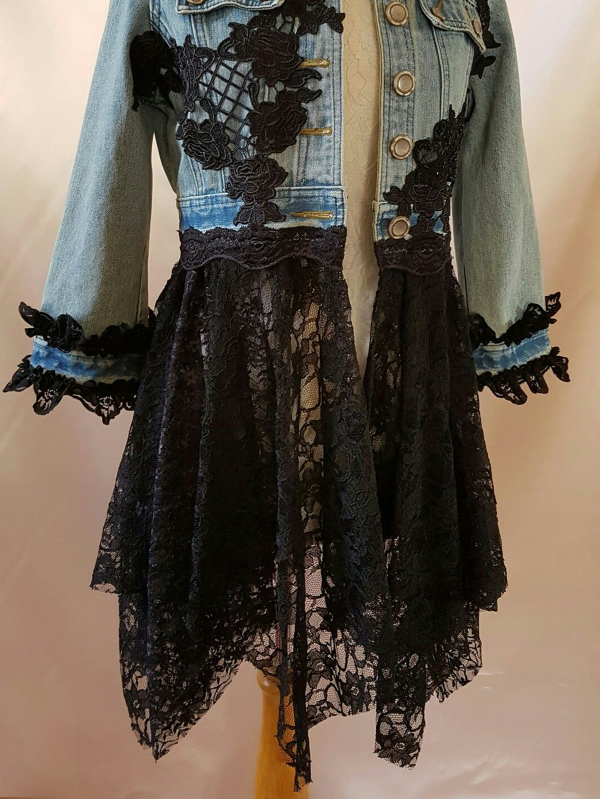 Fashionable Button Up Guipure Lace Patchwork Irregular Hem Denim Jacket