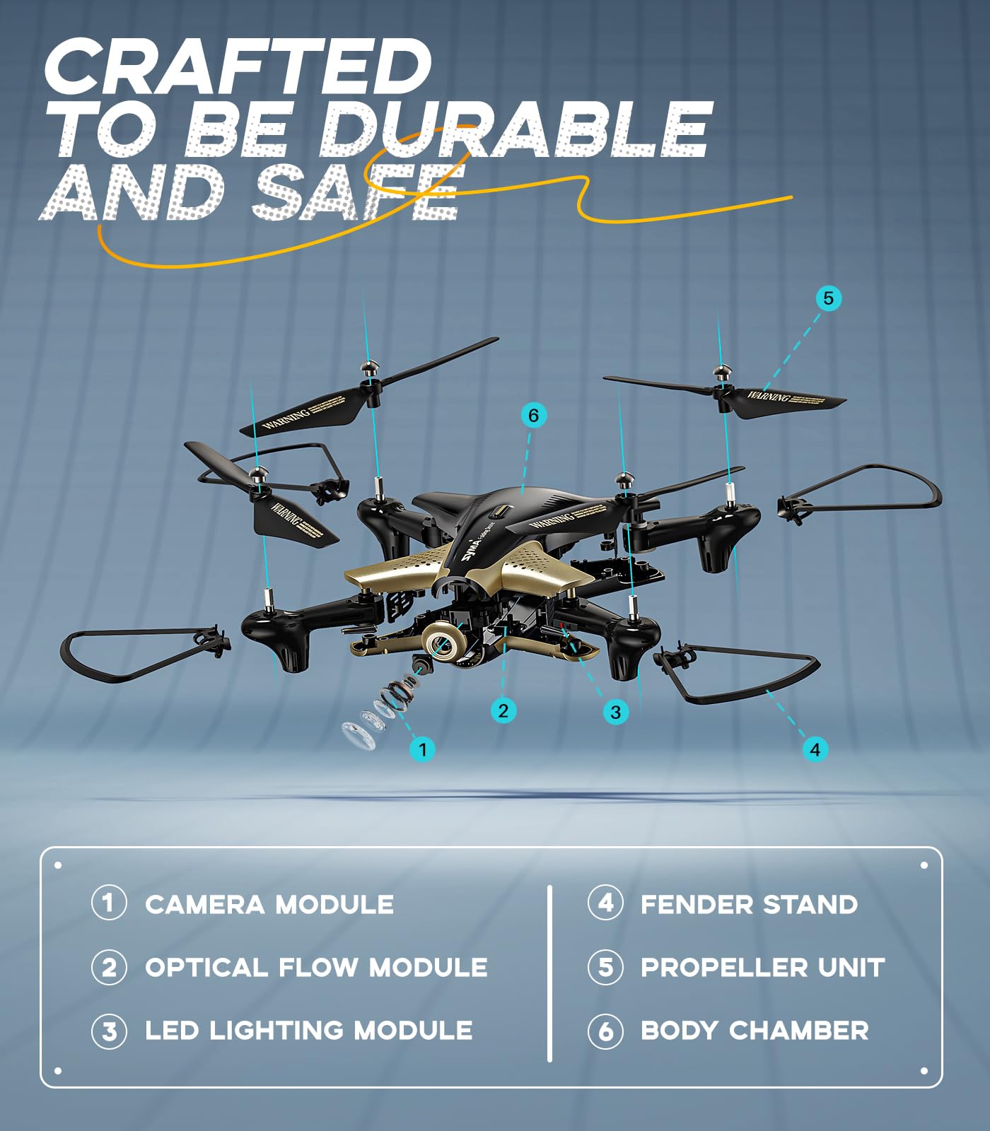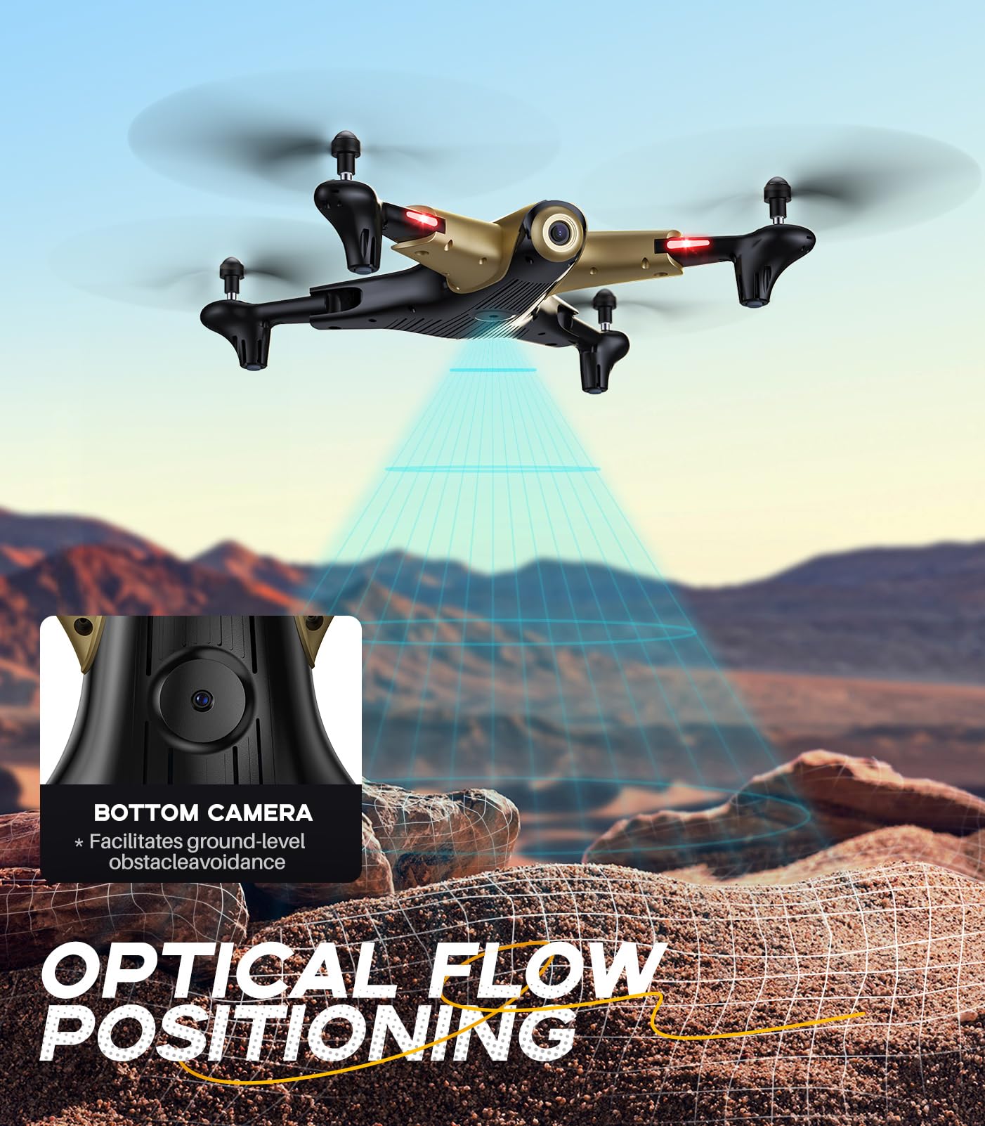 - Advance Optical Flow Positioning: The technology of optical flow positioning makes the remote control quadcopter hover more stable, and achieve better performance in precise location and photograph.