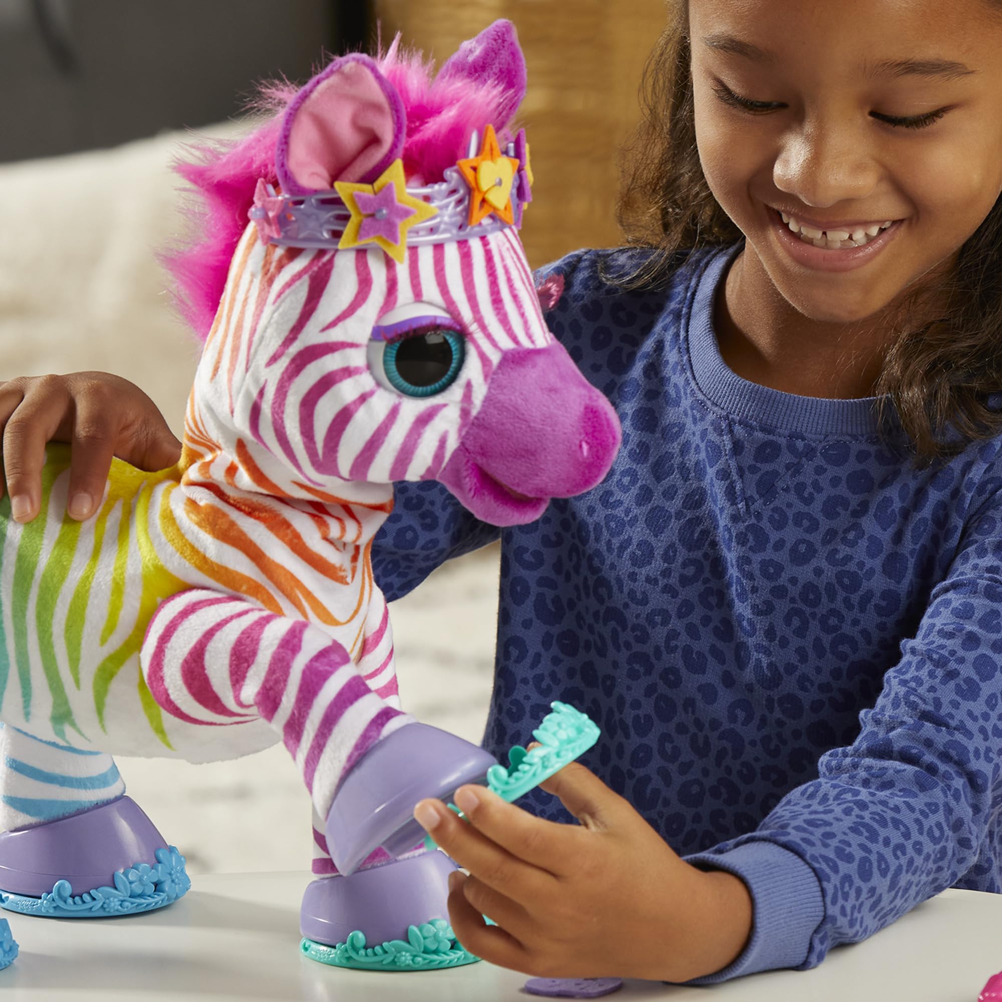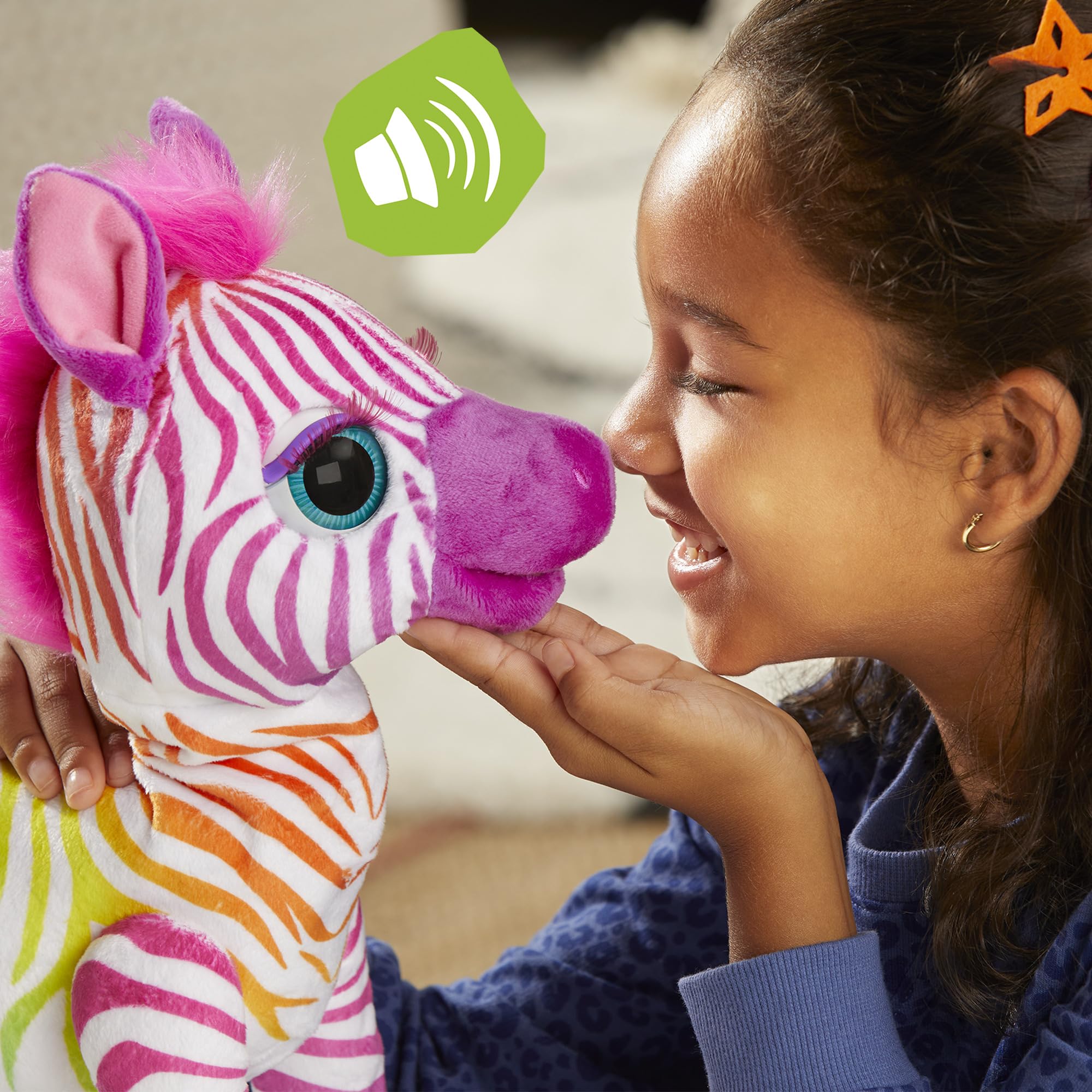 - FURREAL ZEBRA WITH 80+ SOUNDS & REACTIONS: furReal Zenya, My Rainbow Zebra plush toy is so expressive! She blinks her eyes, and moves her ears, head, and neck! She also makes cute sounds. Adorable zebra toys for girls and boys who love zebra and pony toys!