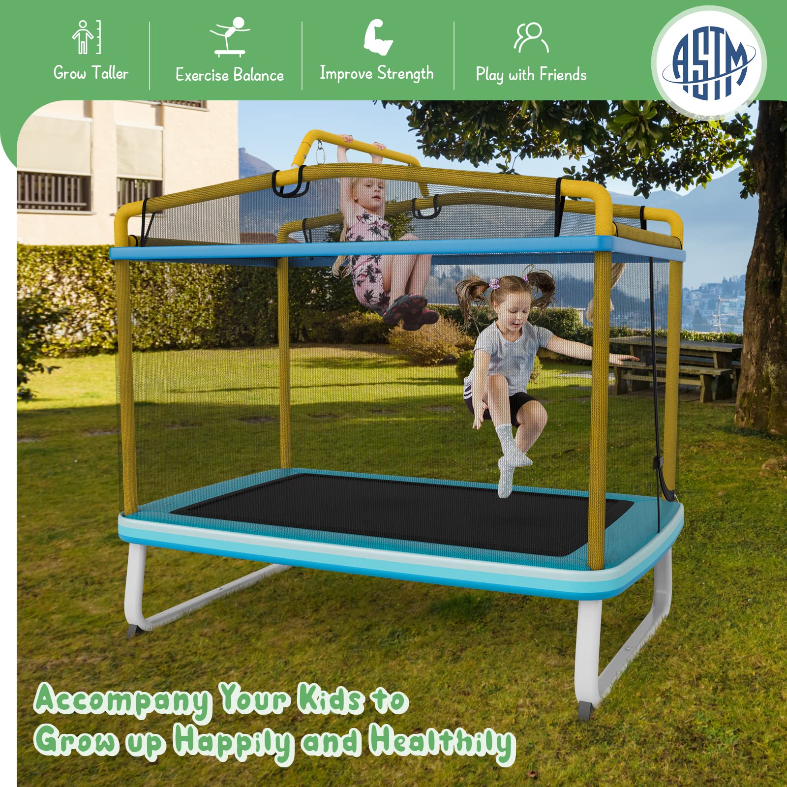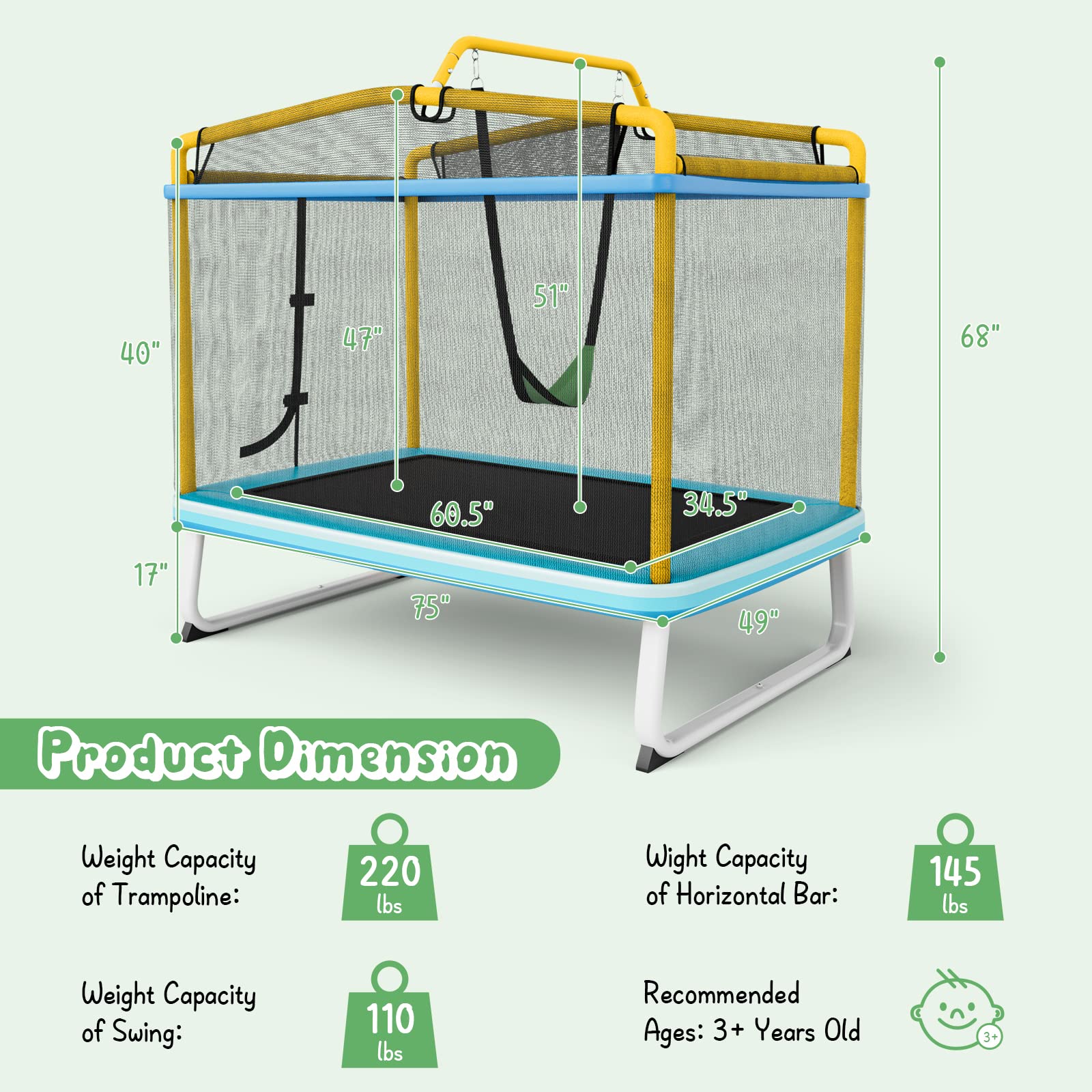 - [ 3-in-1 Versatile Design ]: Apart from serving as a trampoline, the ASTM approved toddler trampoline is also available in a swing and horizontal bar. As a result, the kids trampoline with net is able to offer your child multiple choices for fun with his/ her intimate friend.