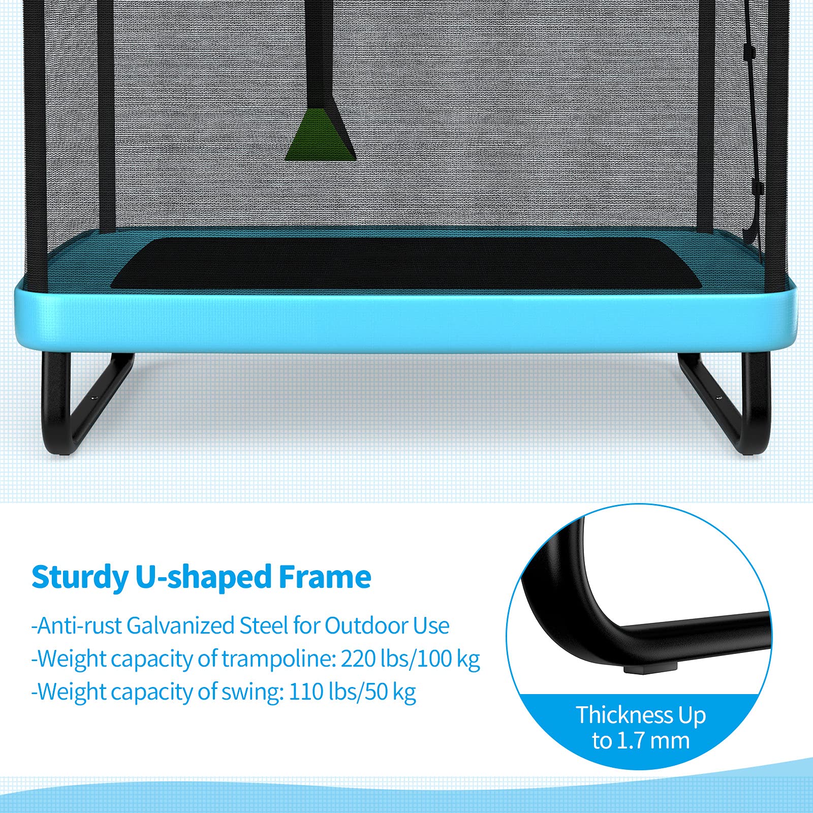 - u2728 Built for Stability: Made of heavy duty galvanized steel, this kids trampoline is anti-rust and durable for both indoor and outdoor use. At the same time, the U-shaped structure and anti-skid feet mat at the bottom ensures its strong stability. Hence, it is able to hold up your kid easily (220 lbs for trampoline and 110 lbs for swing).