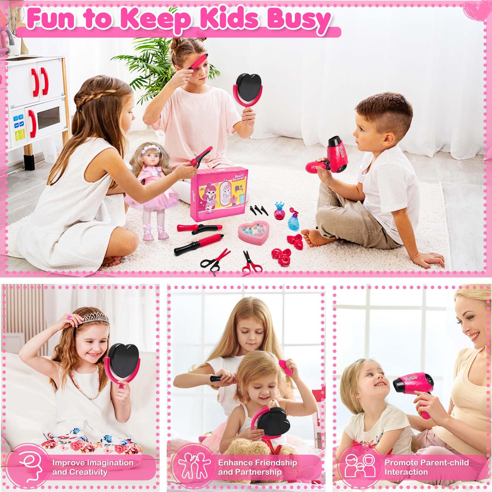 - ud83dudc9dToddler Toys For Girls - Our toddler girls toys age 6-8 is an 15-piece hair beauty salon pretend play set. The 3 year old girl gifts toys hair stylist set includes apron, cape, mirror, curling comb, 5 hair clips, hair dryer, 2 perfume bottles, curling wand, non-cutting scissors, thinning shears. What a realistic kids hair salon playset toys for 3+ year old girls, provideing hours of fun and keeps kids away from electronic devices