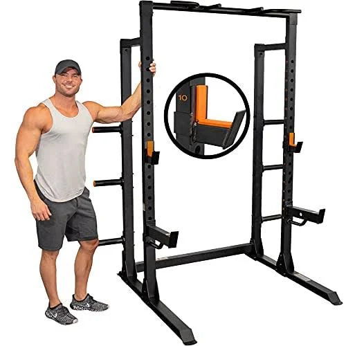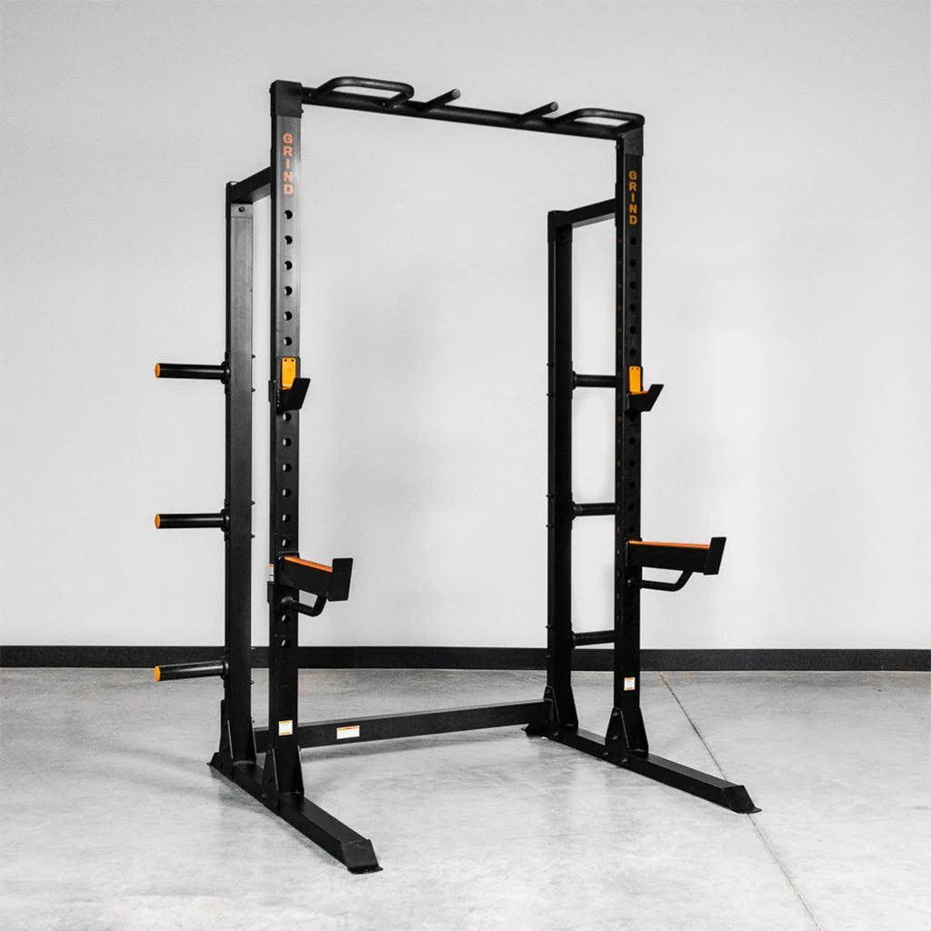 The GRIND Fitness Chaos 4000 is the biggest and beefiest of the collection. The Chaos 4000 has the features of a top of the line squat rack, but with a reasonable price tag.With safety spotter arms, a weight rating of 1500 lbs, handy weight plate storage right on the rack, a multi-grip pull-up bar, and more, this rack 100% delivers on functionality for all your beast-mode moments.