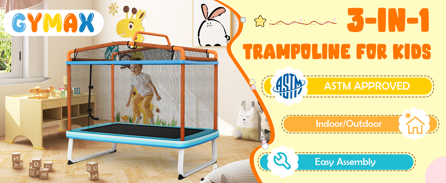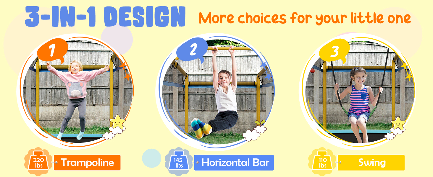 • u30103 in 1 Designu3011GYMAX multifunctional kids trampoline features removable swing and horizontal bar, offering more playing options. With this small trampoline, your little one would have fun at jumping, swinging or even practicing gymnastics.