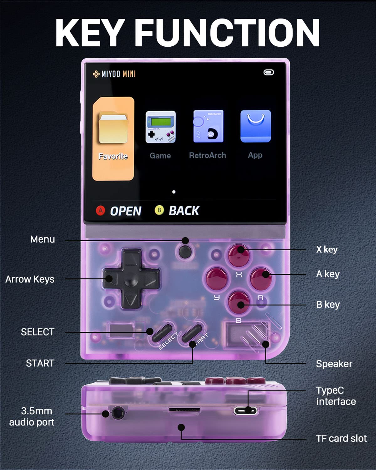 - ud83cudfae[Package includes] : 1 Miyoo mini handheld game console, 1 64G TF card, 1 USB-C charging cable, 1 TF card reader, 1 manual,1 game console package