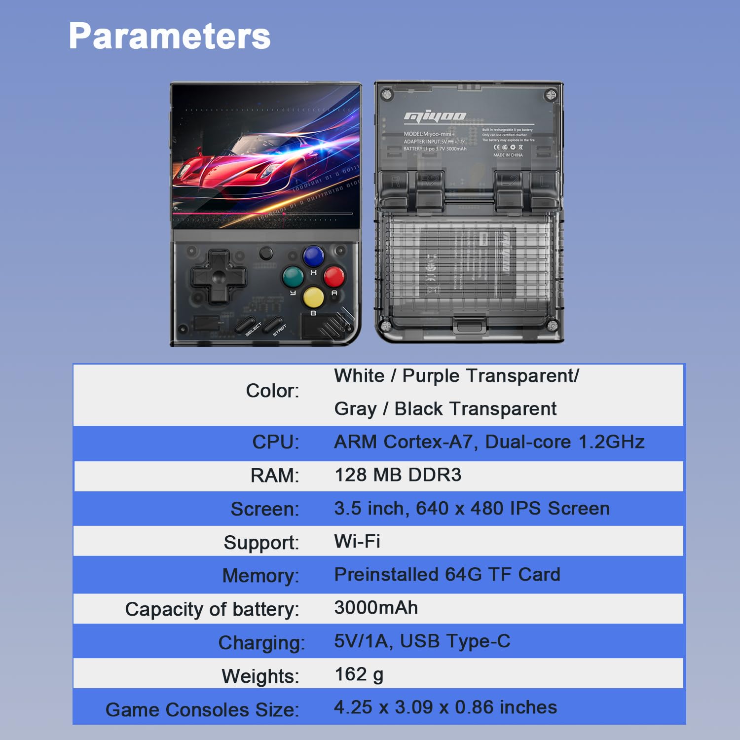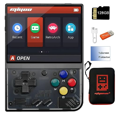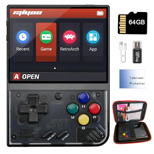 - Package Contains: 1 x Miyoo Mini Plus Game Console(Black Transparent), 1 x Screen Protector, 1 x 64G TF Card, 1 x Carry bag, 1 x User Manual, 1x USB-C Charging Cable, 1 x Card Reader