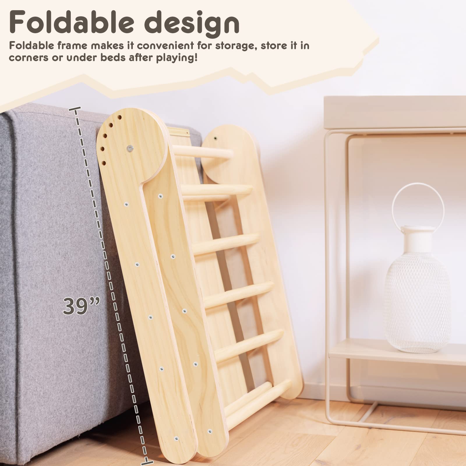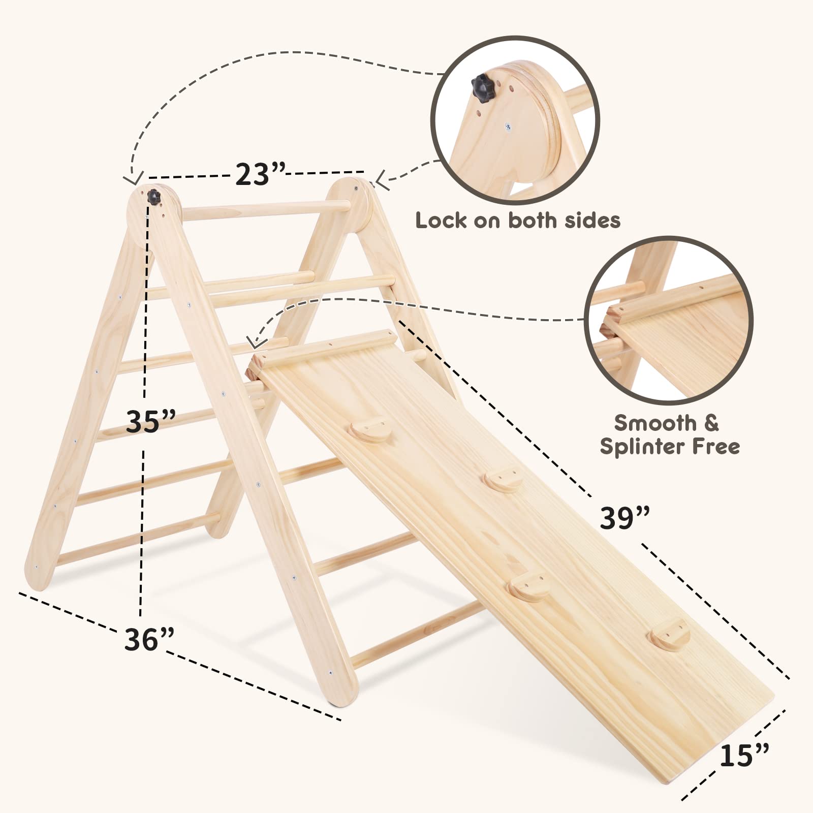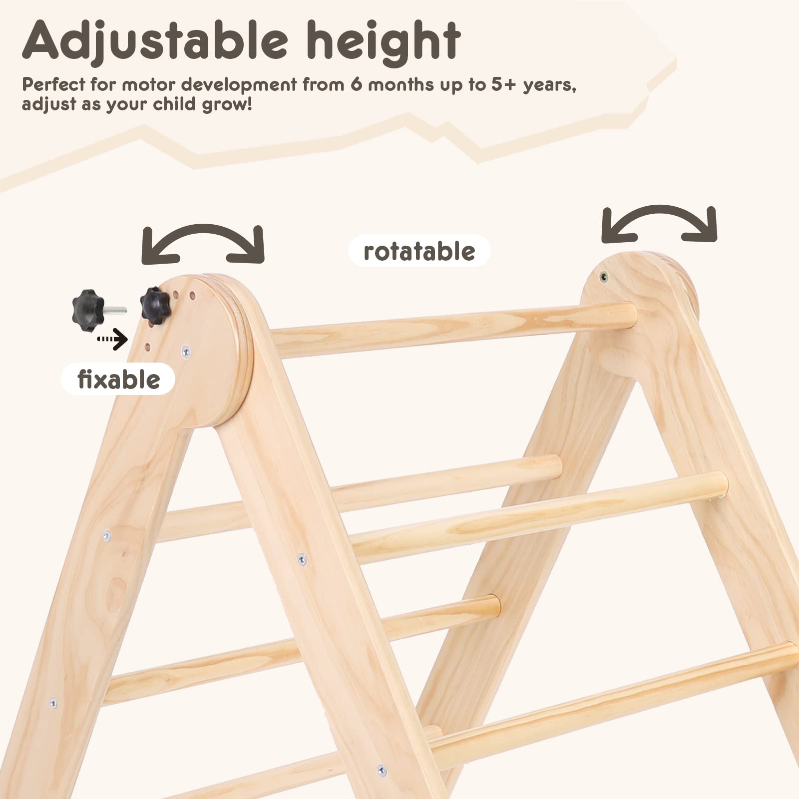 - Safety is our top priority, which is why we only use high-quality, sustainable water-based, and environmentally friendly varnish for the coating. Our products do not cause any allergic reactions and do not emit any harmful substances. The climbing triangle is an excellent training device that helps babies develop their muscles, balance control, and courage.