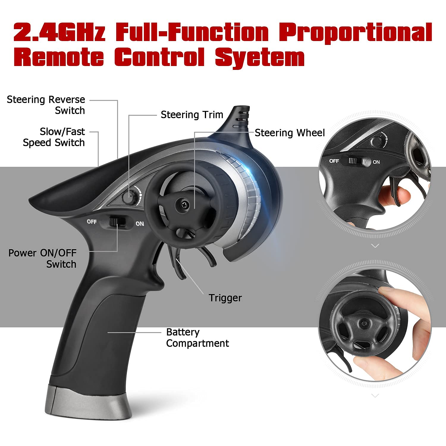 - 2.4GHz full-function proportional radio control system suffices a stable control range within 280 feet. Reliable transmission forward, brake and reverse would never fail. Splash waterproof electronic components make a all-terrain vehicle out of this truck. No worries to run this remote control cars on grassland , sands, and bumpy grounds.