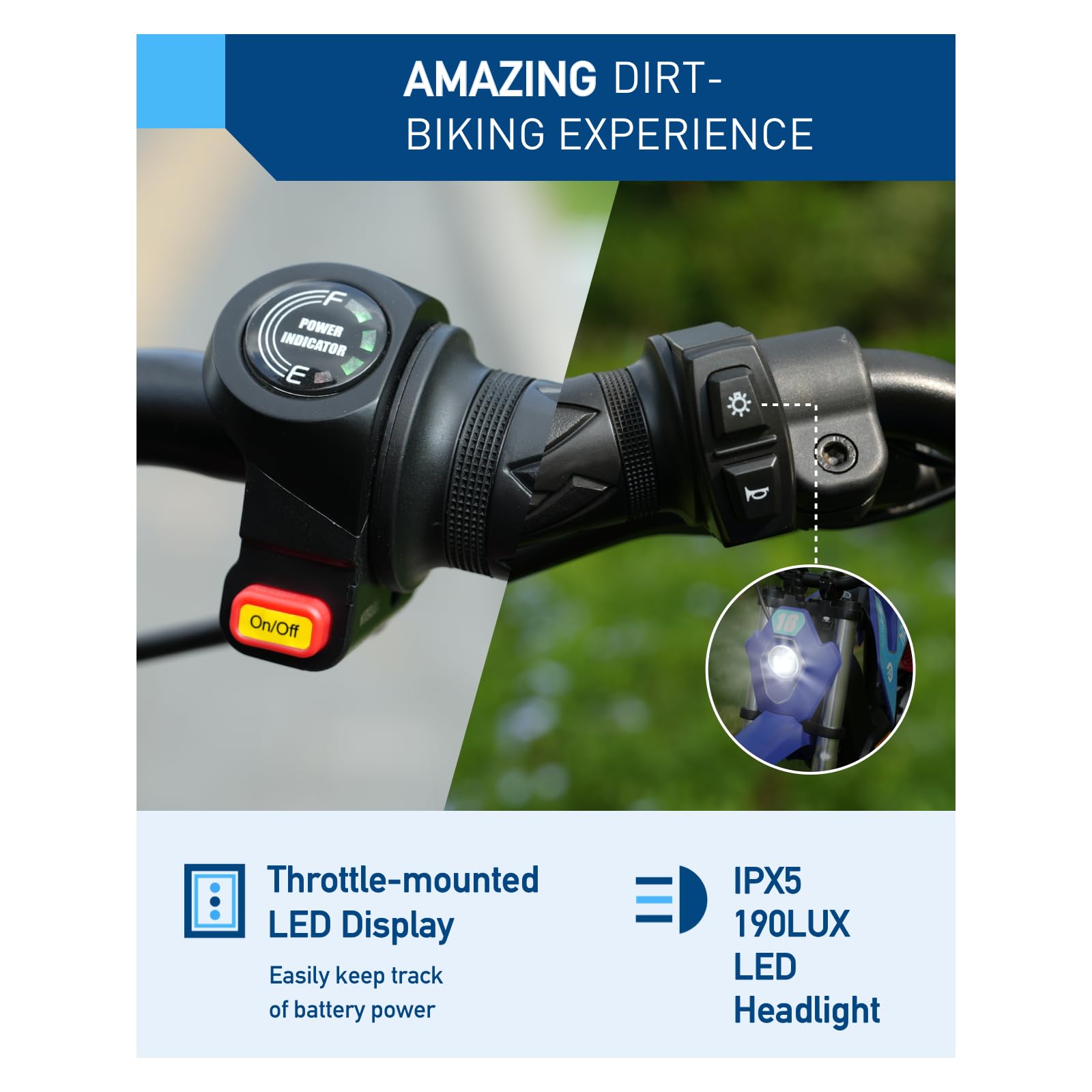 - SAFE SPEED MODES: The dirt bike has 3 safe speed modes - Low: 5.0 mph (8 km/h), Medium: 7.5 mph (12 km/h), High: 15.5 mph (25 km/h). you can choose to use any speed to give you the best riding experience and keep your child safe.