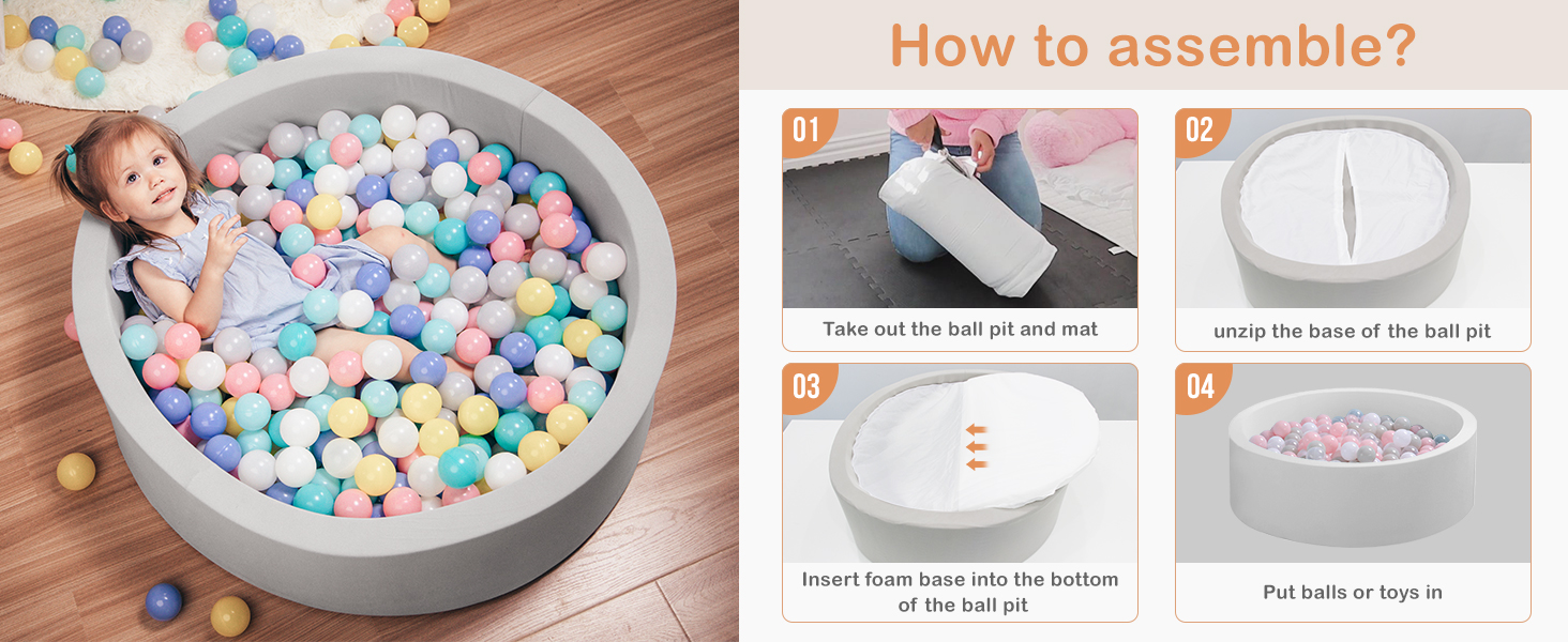 • [Bottom Foam Installation]: FYI:The bottom foam does not come with cover,it is desinged to be inserted into the bottom of the ball pit cover u25cfWhen you received the ball pit,please turn upside down the ball pit and there is a zipper on the bottom of the cover u25cfUnzip the cover,fold the bottom fom into half and insert it in the bottom of the ball pit cover. u25cfAdjust the foam so that the whole section goes into the cover,then zip the cover u25cf Flip ball pit over,adjust the ball pit if necessary.