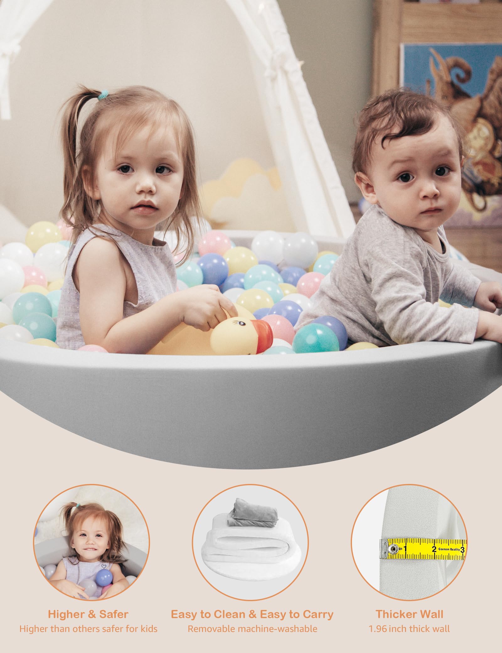 - [Vacuum Seal Design ]The ball pit is sealed in a vacuum seal bag for smart shipping. The foam expands but will not look like a perfect circle immediately upon unboxing.Please leave it for 48 hours and it will take shape gradually. In addition, If the ball pit does not recover ,just use the cold air mode of the hair dryer to easily restore it.