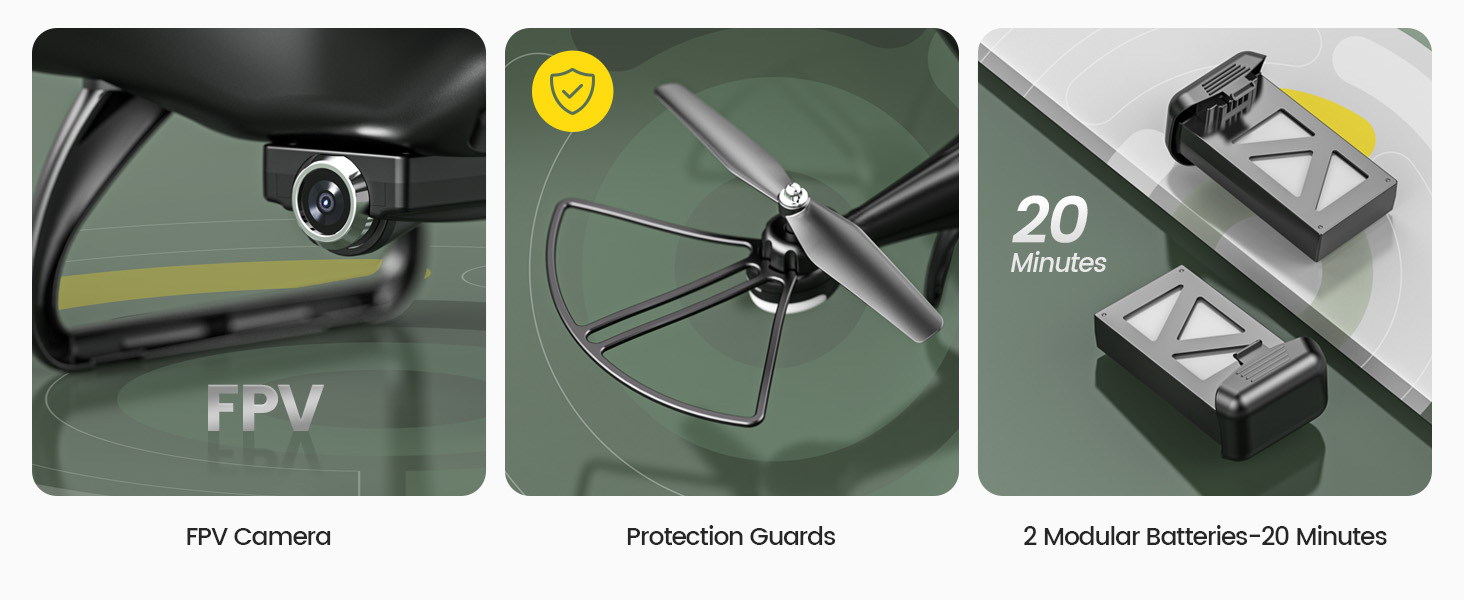 - 2 Modular Battries: 2 batteries can support a 20 Minutes flight which makes it easy to replace battery and safe to charge battery.