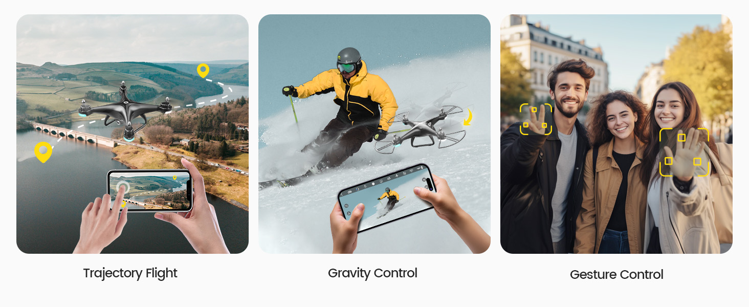 - Mobile Control: Through the APP, multiple functions, Voice Control, Gestures Control, Trajectory Flight and Gravity Sensor Control can be activated. Instruct the camera to take photos by gestures of Scissor and videos by Paper.