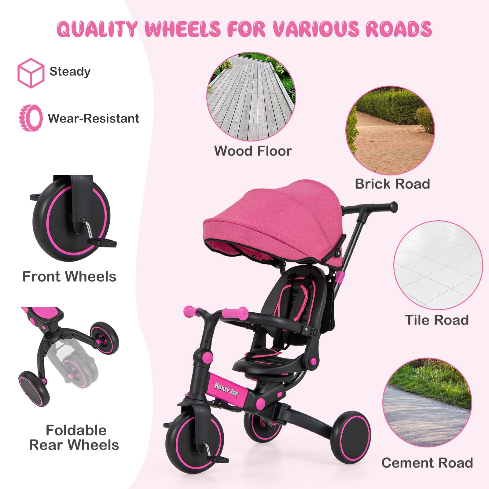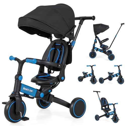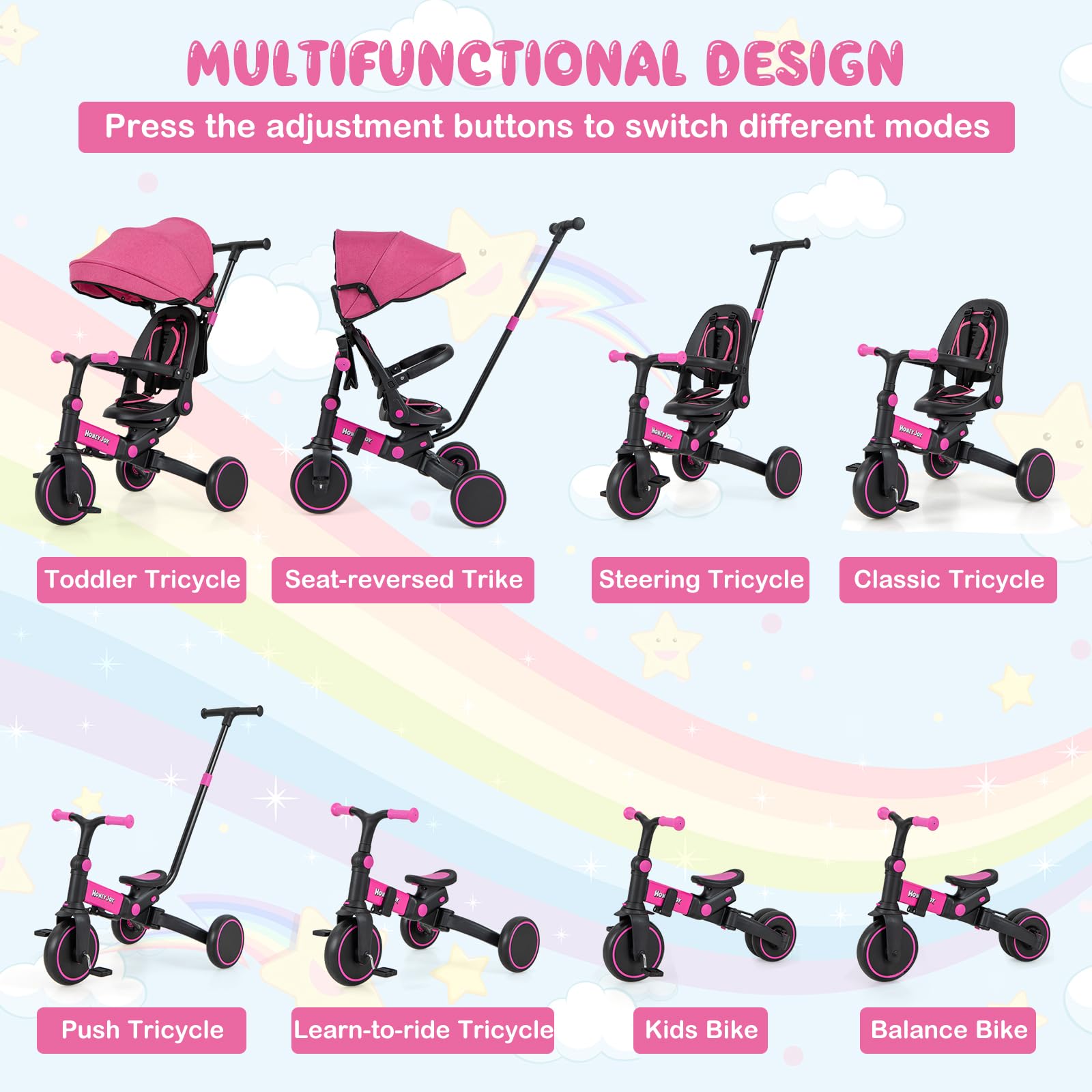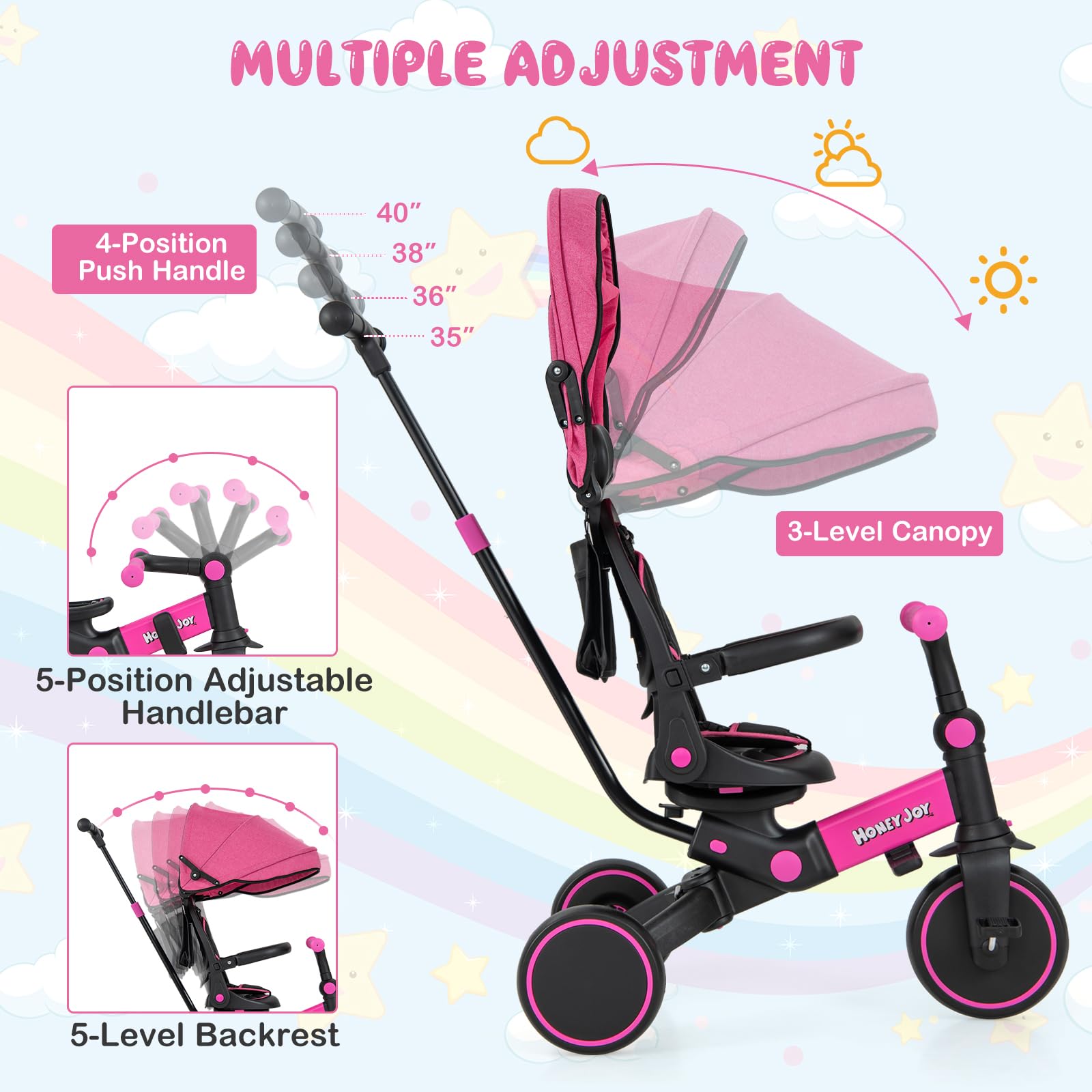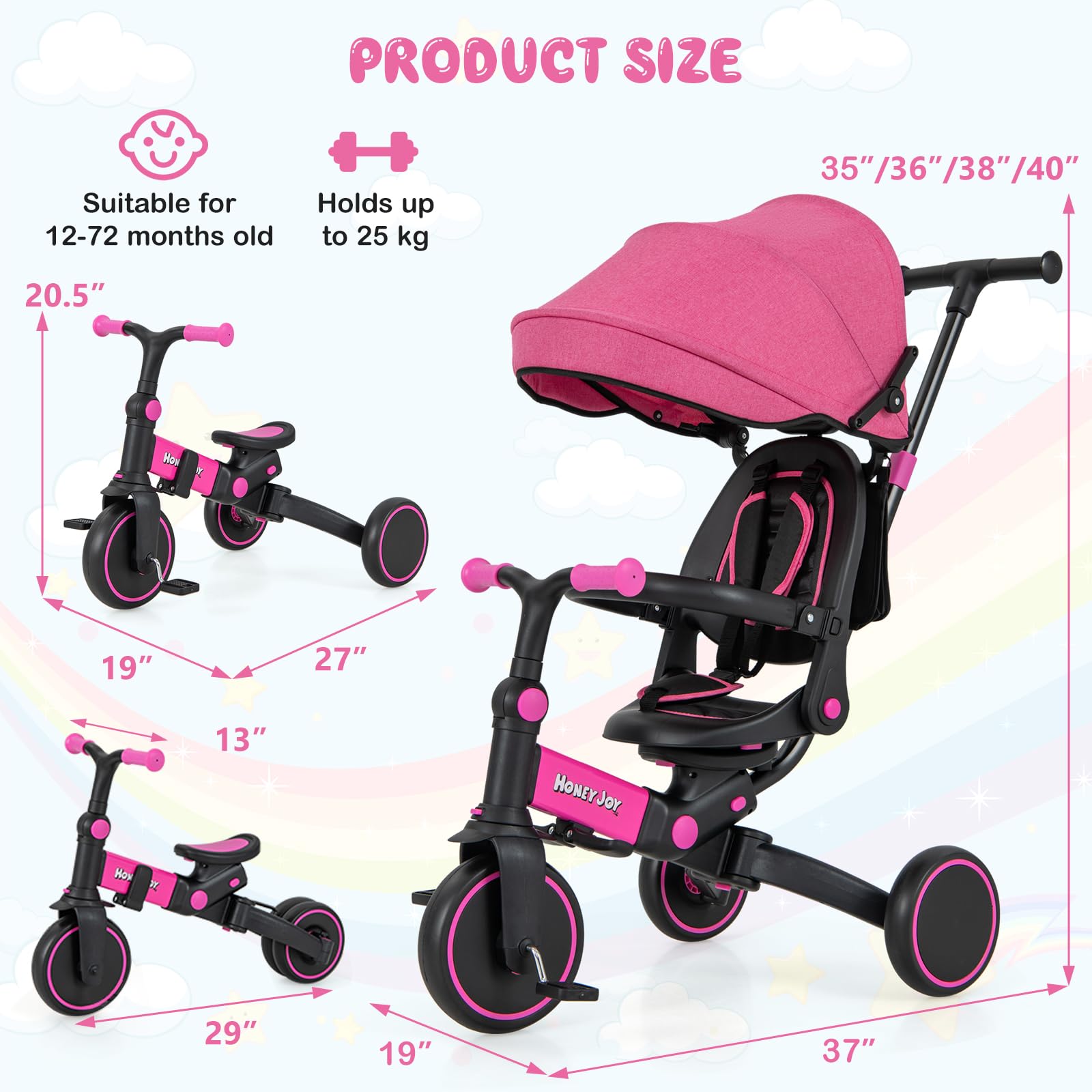 - u3010Multifunctional Kids Trikeu3011The 8-in-1 HONEY JOY tricycle allows you to press the adjustment buttons to switch different modes (toddler bicycle, seat-reversed trike, steering tricycle, classic tricycle, push tricycle, learn-to-ride tricycle, kids bike or balance bike). Therefore, the trike is suitable for 12-72 months old kids. And the seat can be reversed to meet your different needs.