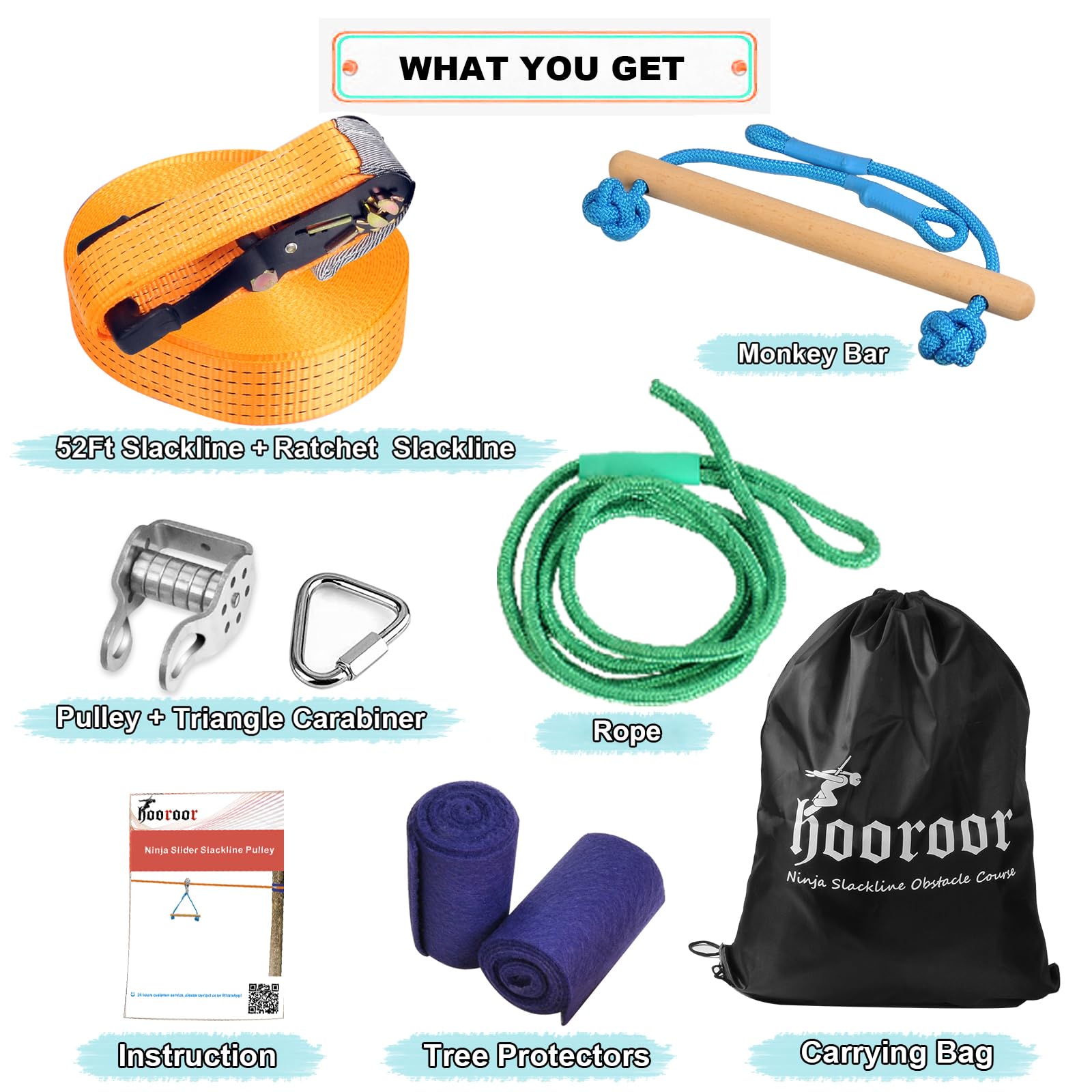 - ud83dudcaa Our set includes everything you need to get started without the need for additional parts. The package includes a 52" Slackline, Monkey Bar, Ninja Slackline Pulley, Tree Protectors, rope and a Carrying Bag. You can also purchase other accessories to enhance the experience, such as a Swing Seat, Ring Wheel, Gym Rings, and more.