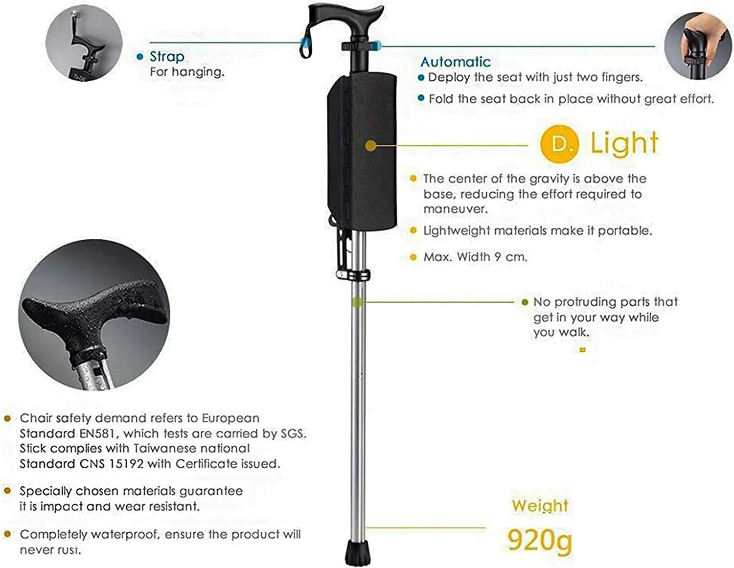 ★Material: Cane with seat is made of aviation aluminum material,has high hardness, Light weight, easy to carry, easy to fold.
