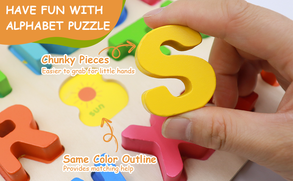 - FUN WAY TO LEARNING ABC LETTER: Our abc letter puzzle provides a terrific and interesting way for kids to learn their ABC's. Like you speak out "A is for Apple" once the puzzle piece is properly placed. Bird is B, Car is C. Putting the letters on the corresponding spaces can improve your child's finger movement ability, help babies match letters quickly with pictures