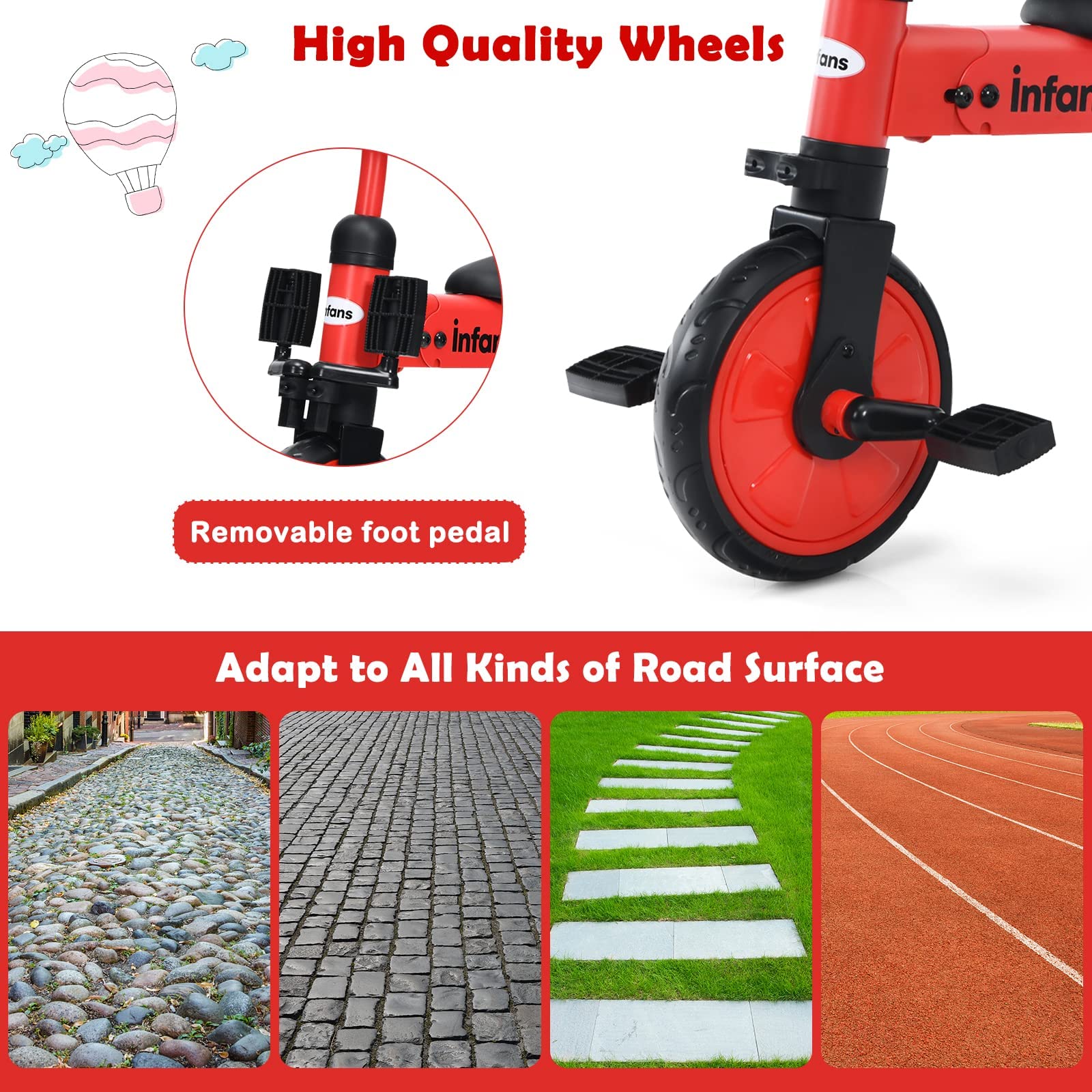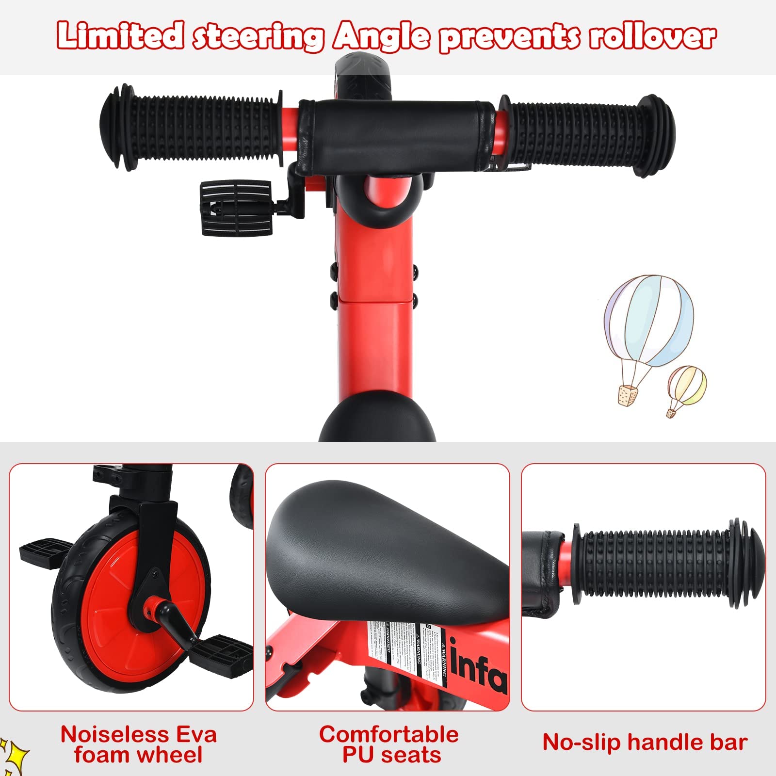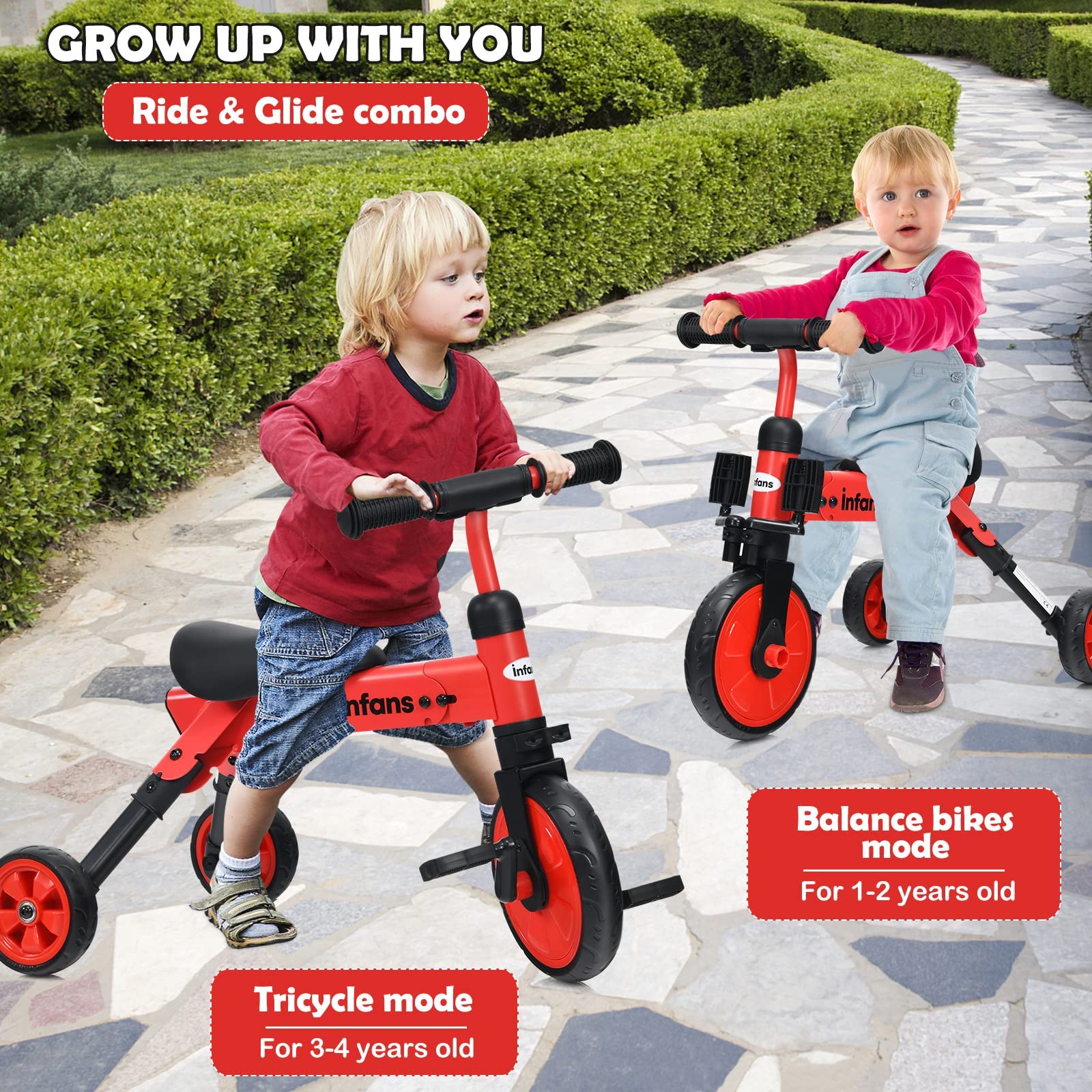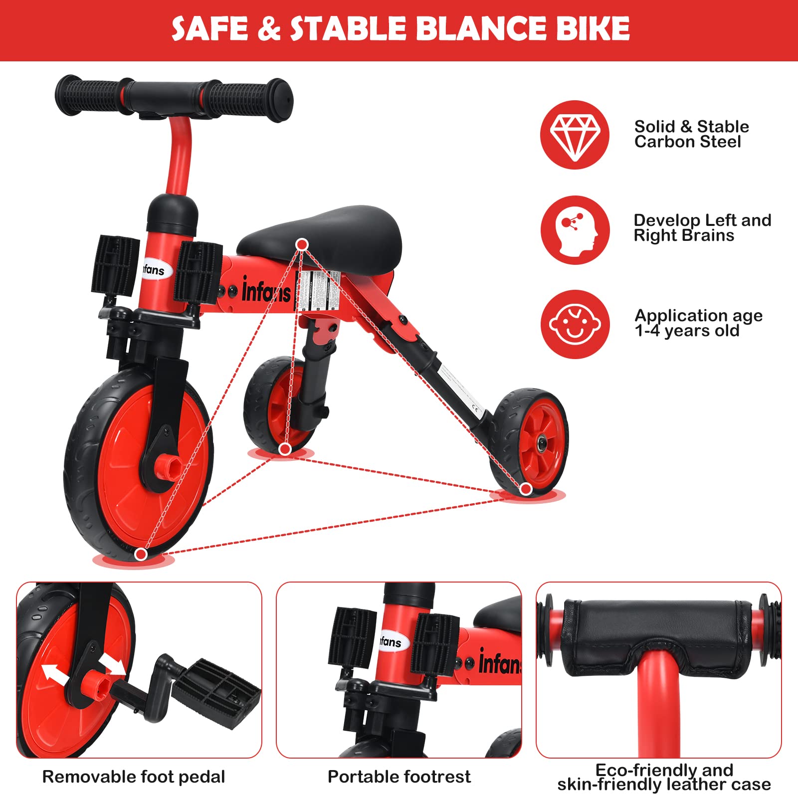- ud83dude18u30102 IN 1 DESIGNu3011INFANS indoor training toy is easily transitions from a balance bike to a tricycle with removable pedals. As a baby balance bike, little one can masters the skills of balance, steering and coordination. As a toddler trike, it is easier to help balance, and help prevent frustrating situations when tipping over on normal balance bikes.