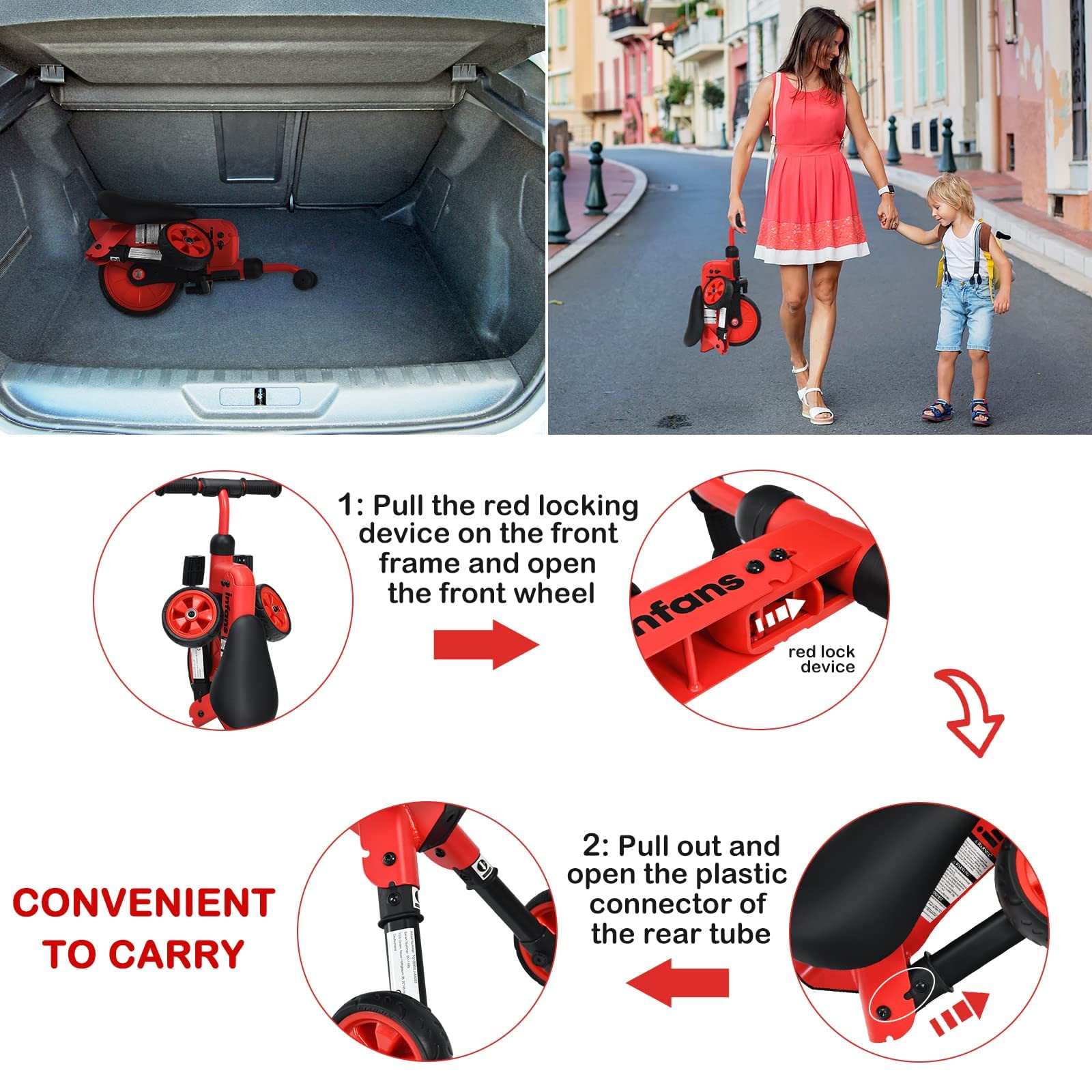 - ud83dude18u3010EASY TO CARRYu3011This foldable lightweight tricycle is so easy to carry around that it takes almost no time to fold up this bike in two steps. Perfect for parents who want to fold up the bike for storage or to shove in the bottom of the stroller to take to the park. It is also easy to convert from a walking bicycle to a pedal tricycle.