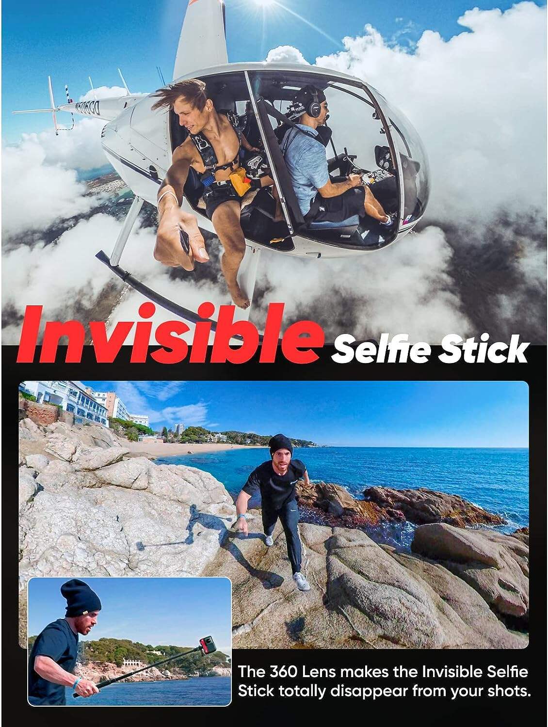 - Invisible Selfie Stick: Don't ruin the view with an ugly selfie stick! The 360 Lens makes the Invisible Selfie Stick totally disappear from your shots for impossible drone-like footage and third-person perspectives.