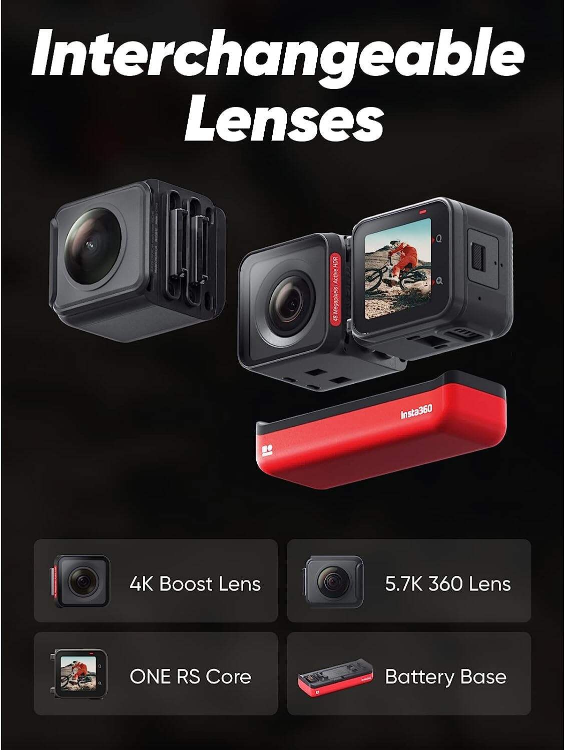 - 4K Boost Lens & 5.7K 360 Lens: Get two cameras in one with Insta360 ONE RS. Swap between the new 4K Boost Lens for stunningly detailed wide-angle videos and the 360 Lens for endless creative possibilities.