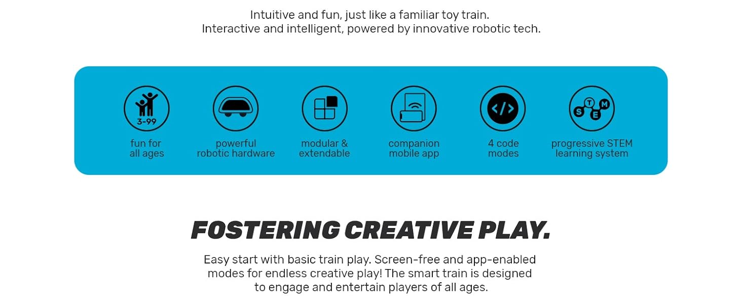 • 4 CODE MODES: 1) Screen-free tactile coding with colored tiles, 2) App-based command editor, 3) Block-based programming using Scratch, 4) multi-train interactive programming in Python.