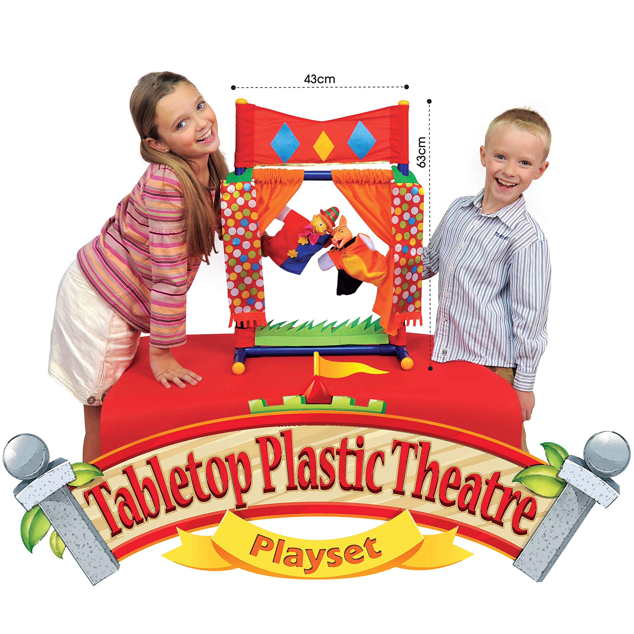 - Table Top puppet theater with curtains that open and close for dramatic effect.