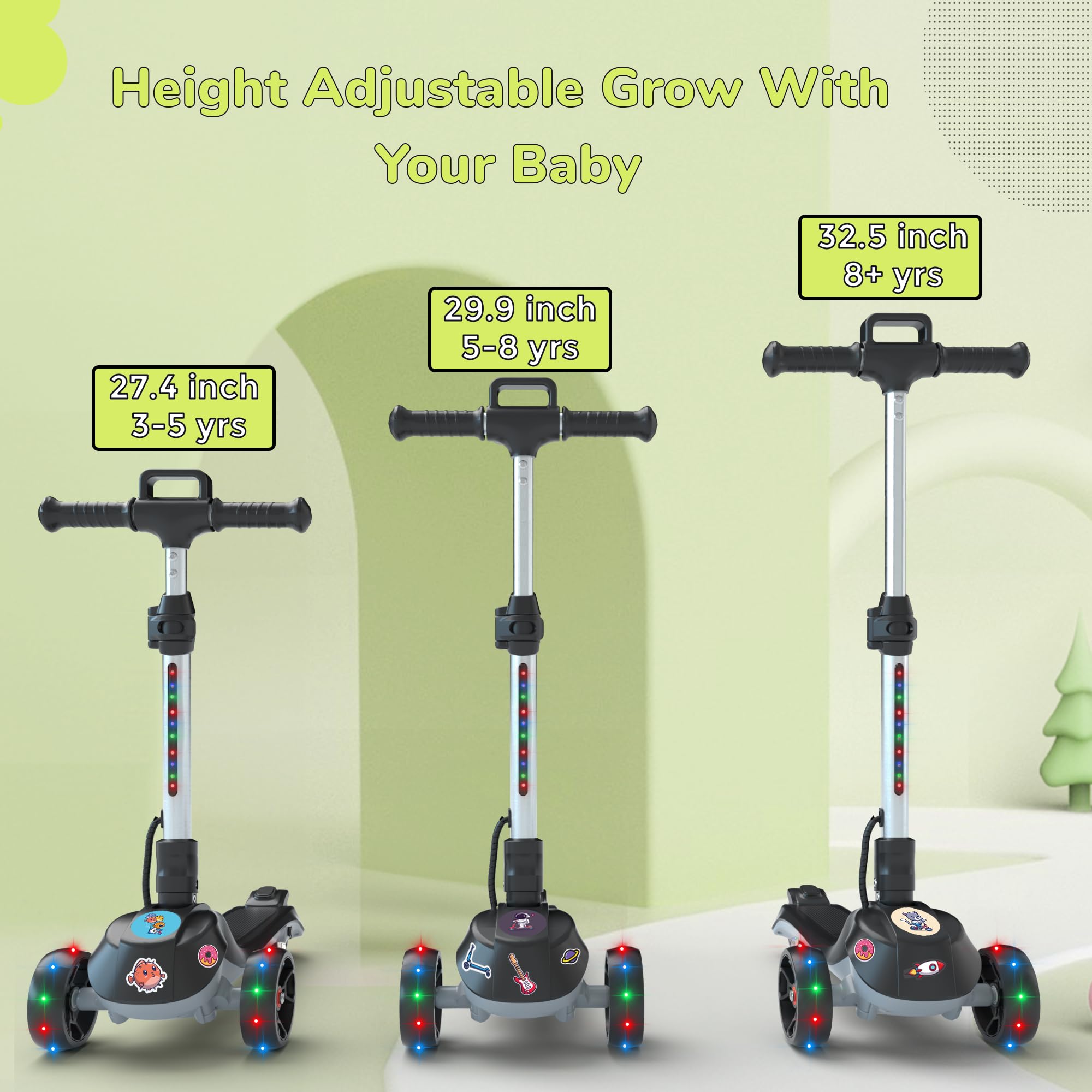 - [Adjustable & Bluetooth Connectable] Our children's electric scooters can meet the needs of different age groups, and we offer three levels of height-adjustable handlebars from 24.8 inches to 33.8 inches. Whether it's a scooter for kids ages 3-5, or a three-wheel scooter for kids ages 6-10, we've got you covered. Bluetooth connectivity lets you connect your smartphone or tablet so your child can enjoy their favorite music while riding