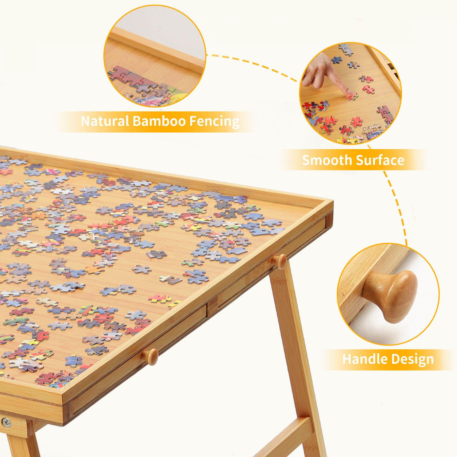 - u3010Smooth Working Surfaceu3011Sturdy smooth natural bamboo work surface lets the pieces glide effortlessly into place, easy to organize. High-quality bamboo for long-time use, no smell, no paint, friendly for your kids. Do not worry about the puzzle falling due to our 3 sided integrated edging. The open side makes it easier to keep your puzzle intact after finishing