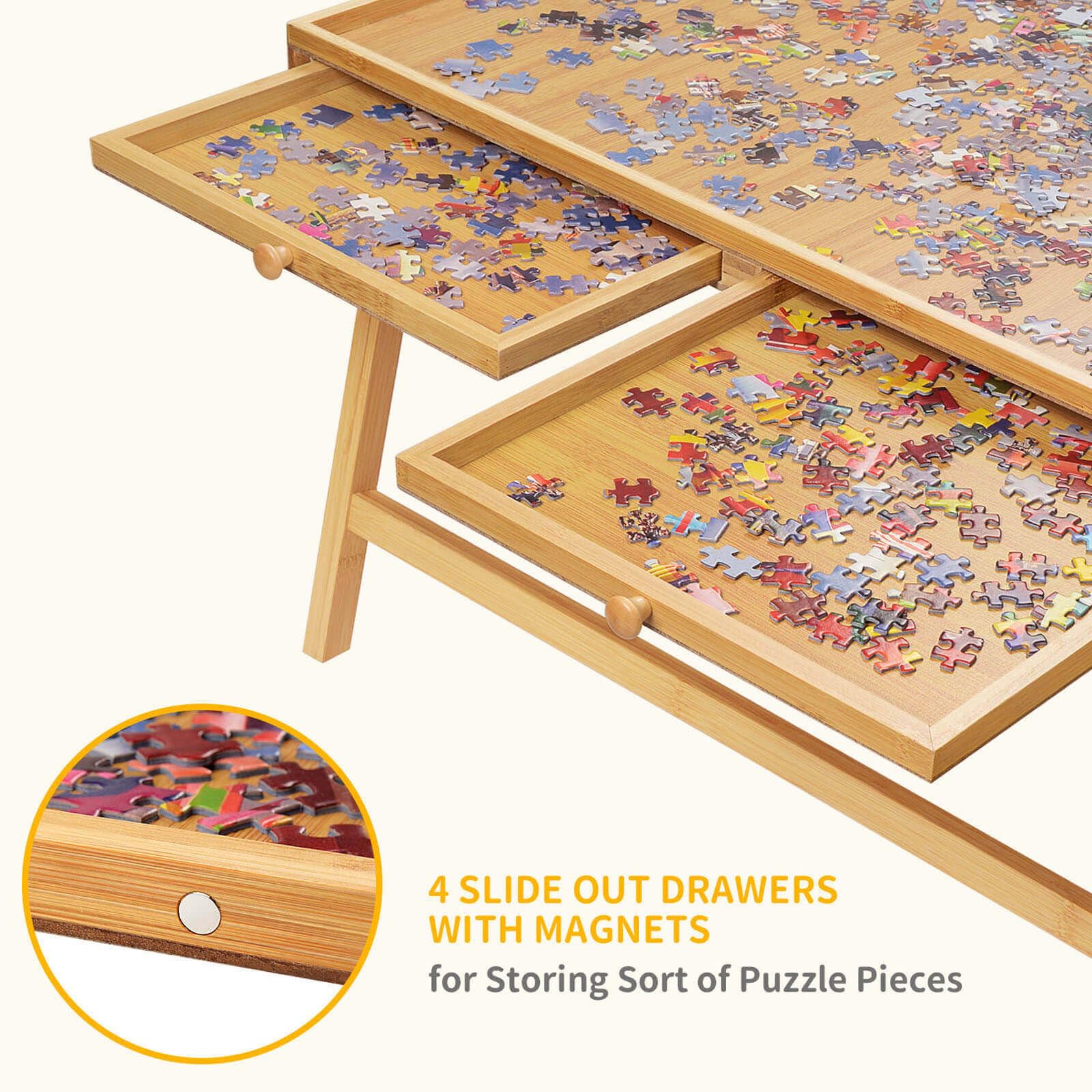 - u30104 Magnetic Sliding Drawersu3011Puzzle board has 4 drawers with legs allowing you to conveniently sort and storage extra puzzle pieces without worrying about lost. Unique magnet closures make sure drawers stay closed, you can also remove drawers from the board and function as individual puzzle tray for sorting details. The puzzle board drawers with wooden handles for easy access sliding